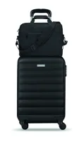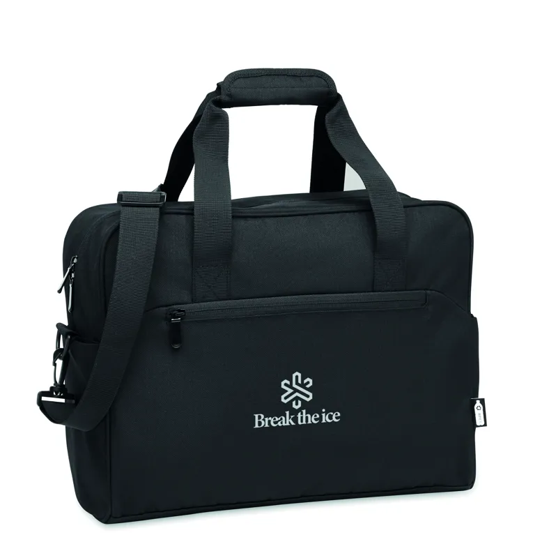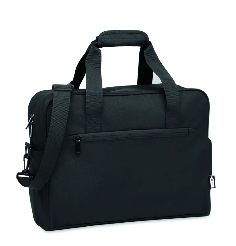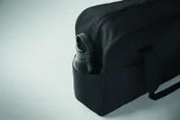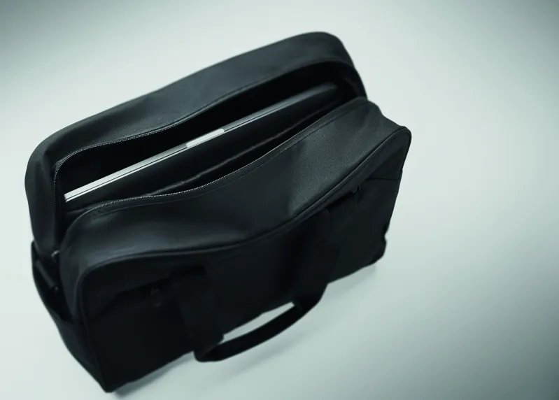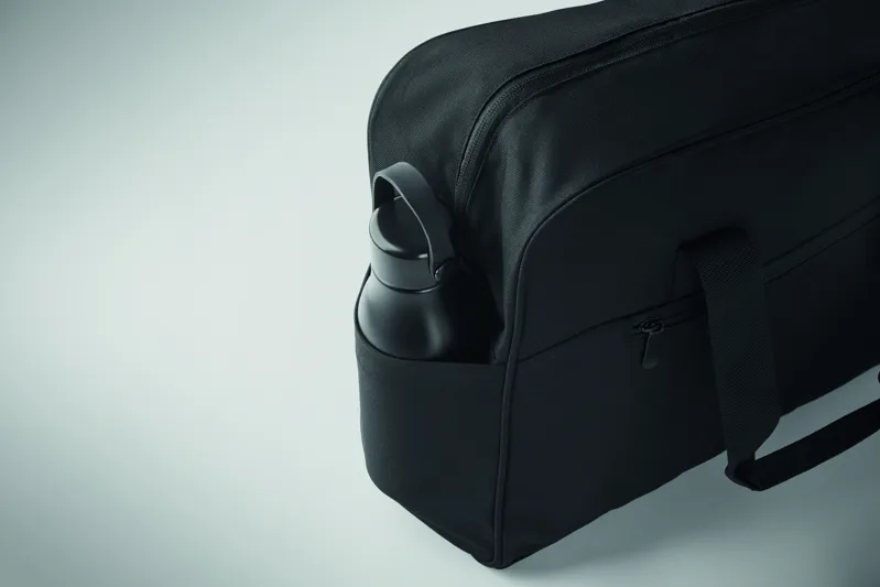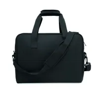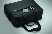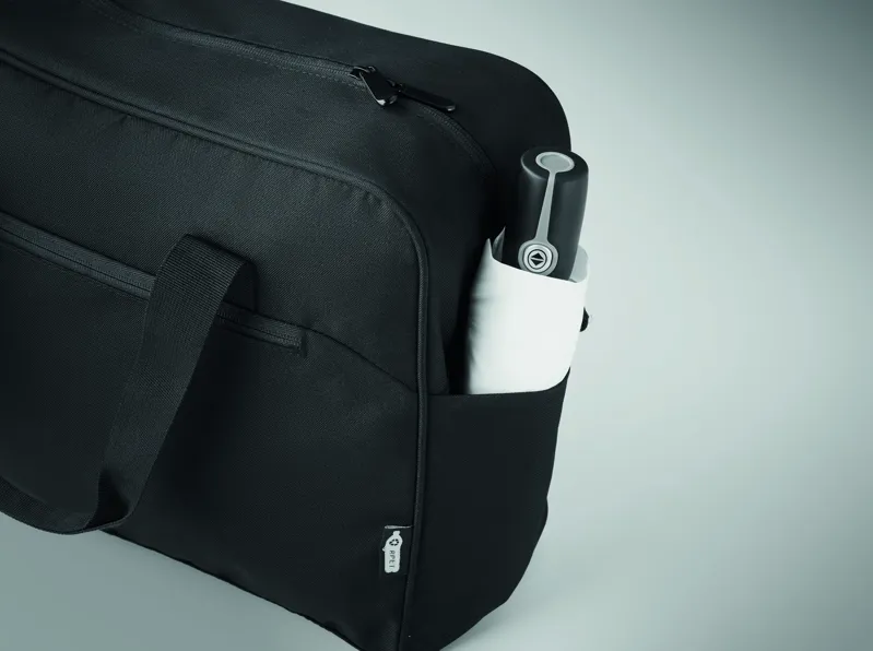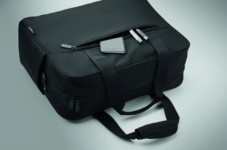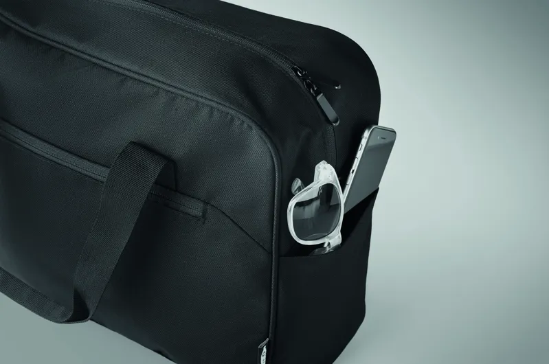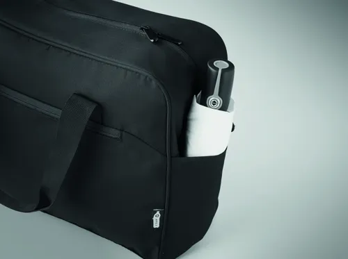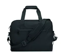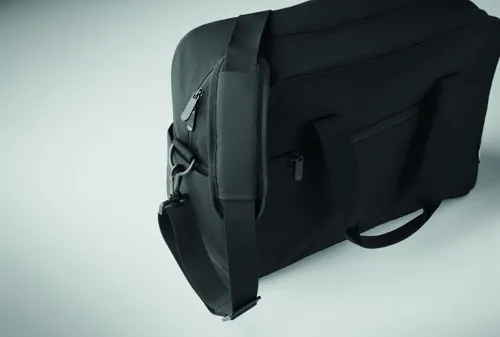 Kézipoggyász utazótáska 600D RPET anyagból, nagy cipzáras elülső zsebbel, két kis oldalzsebbel. 15 colos laptop rekesszel. Párnázott, levehető és állítható vállpánt. Hátoldalán gurulós bőröndre illeszkedő pánttal.