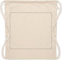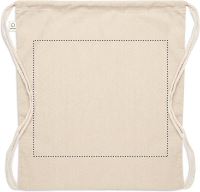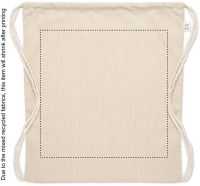 Húzózsinóros táska 30% fogyasztás előtti újrahasznosított pamutból és 30% RPET-ből. 140 g/m². Ez az anyag nyomtatás után zsugorodhat.