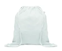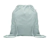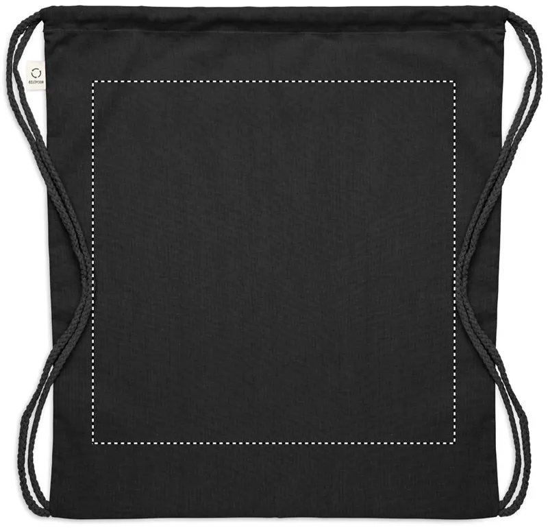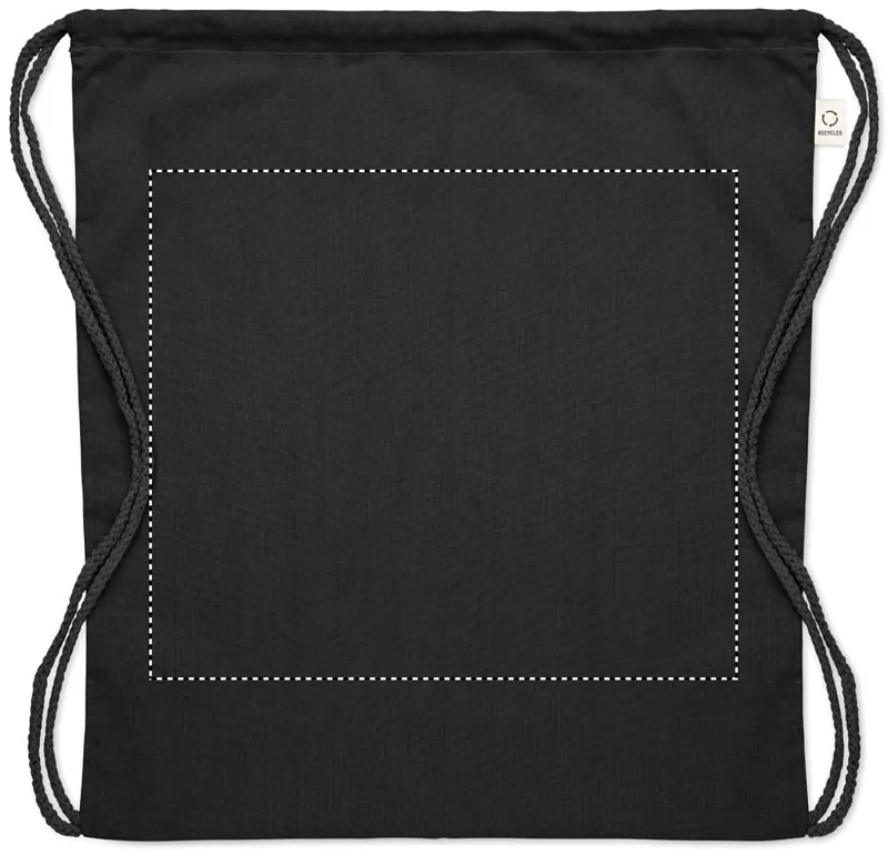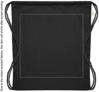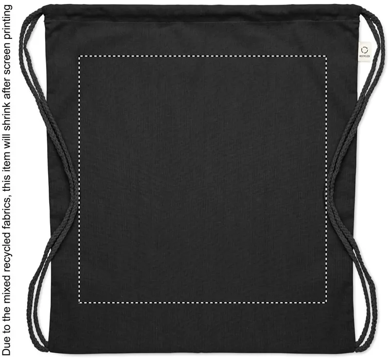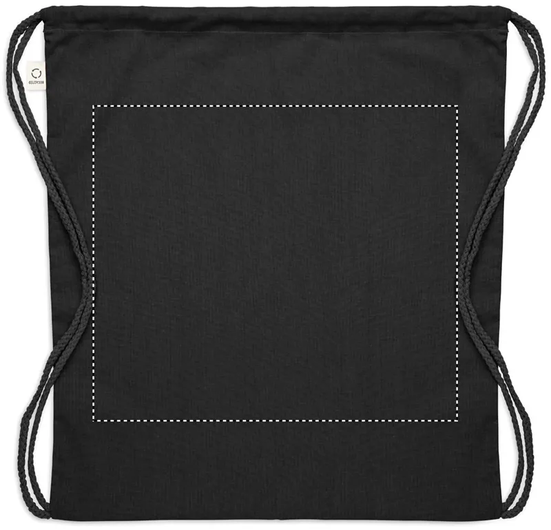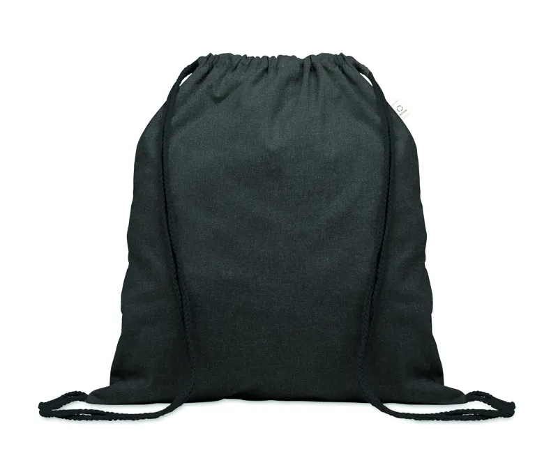 Húzózsinóros táska 30% fogyasztás előtti újrahasznosított pamutból és 30% RPET-ből. 140 g/m². Ez az anyag nyomtatás után zsugorodhat.