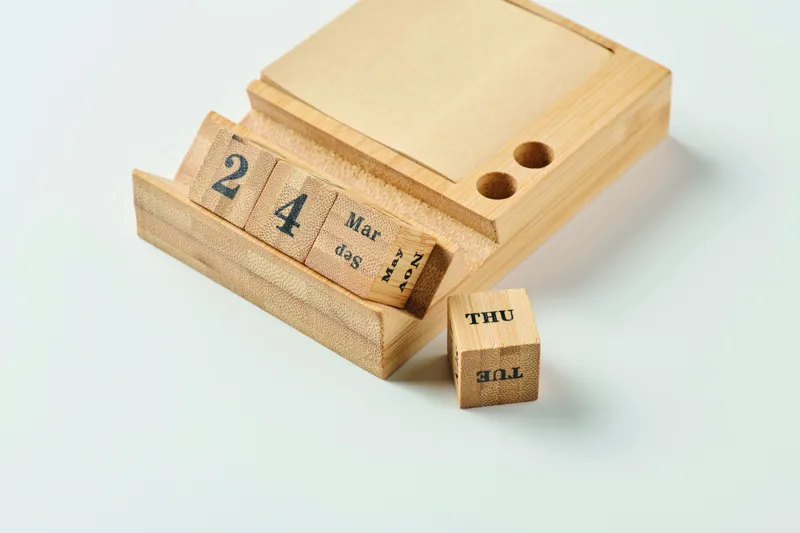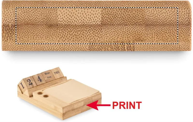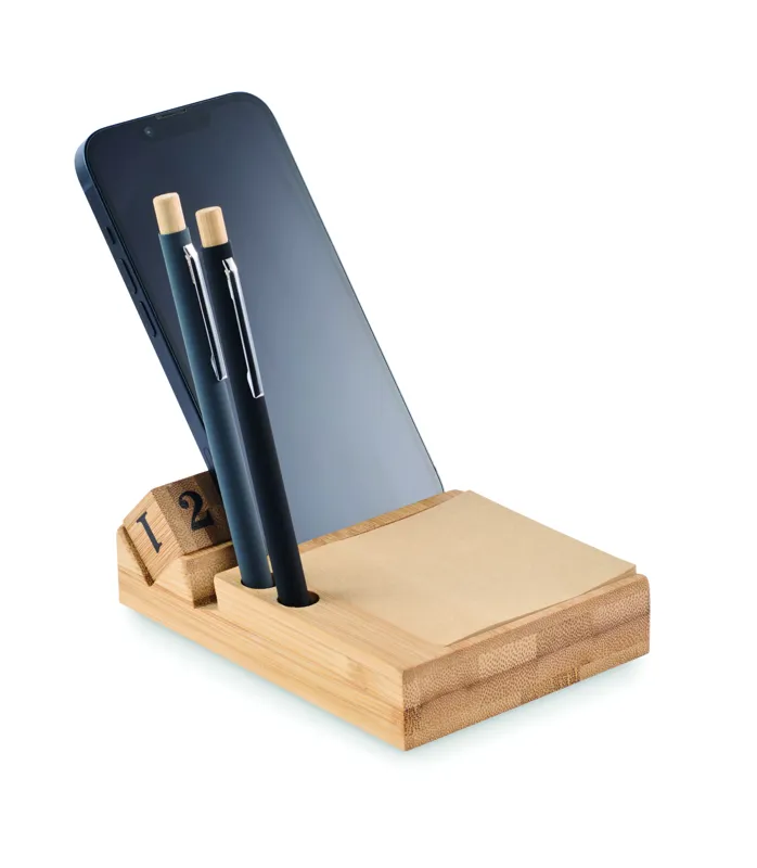 Bambusz asztali öröknaptár telefontartó funkcióval, 2 tolltartóval és 50 lapos öntapadós jegyzetelővel. FSC®-certified | FSC 100%, N5.7, FSC- C213206.