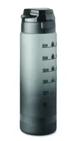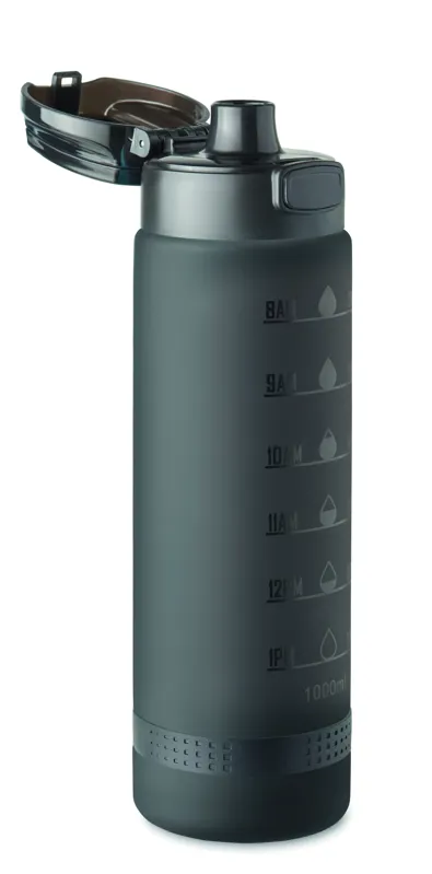 Sportkulacs RPET-ből, motivációs időjelzéssel, egy kézzel nyitható, felpattintható fedéllel, biztonsági zárral és hordfüllel. Szivárgásmentes. Űrtartalom: 1 liter.