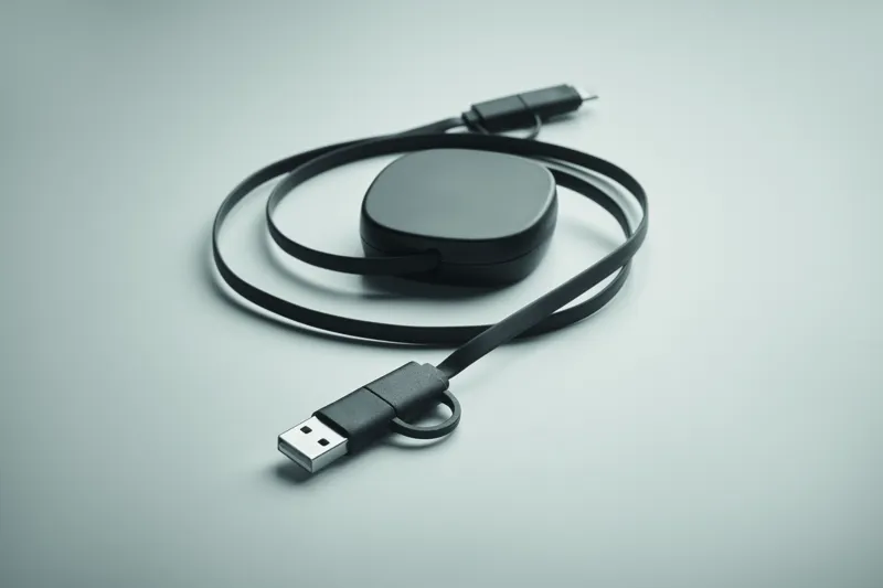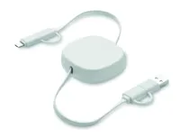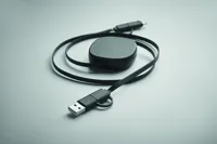 60W-os visszahúzható töltőkábel újrahasznosított ABS házban. Bemenet: 2 az 1-ben C-típusú és USB-A. Kimenet: C-típusú és mikro-B (2 az 1-ben). Kábel hossza: 80 cm.