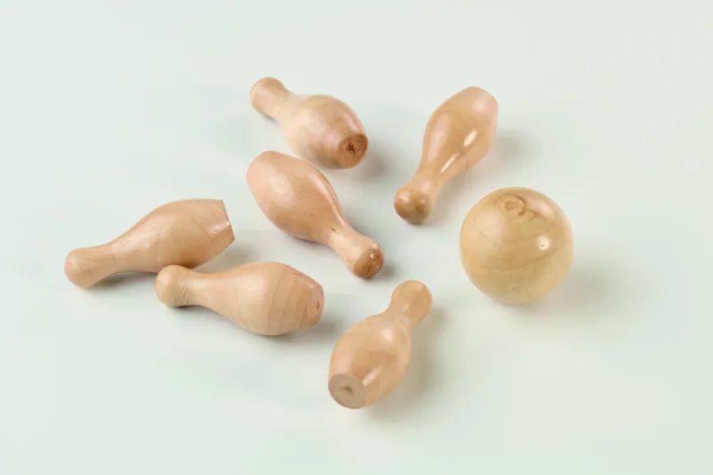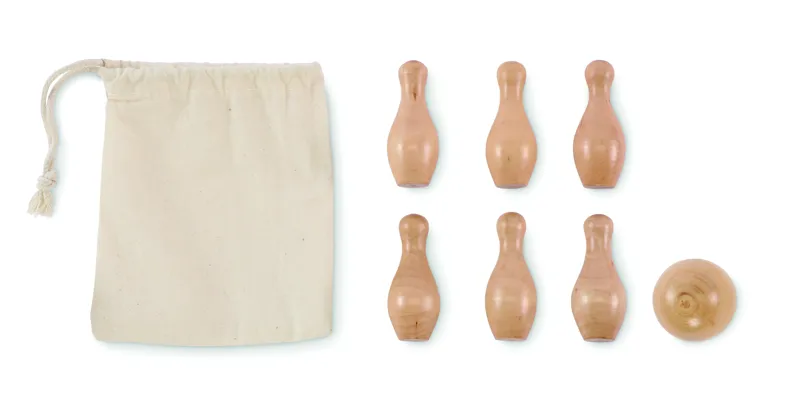 Mini bowling készlet fenyőfából, pamut húzózsinóros tasakban. 6 bábut és 1 golyót tartalmaz. FSC®-certified | FSC 100%, W15.2, FSC-C213206