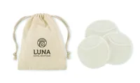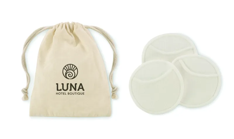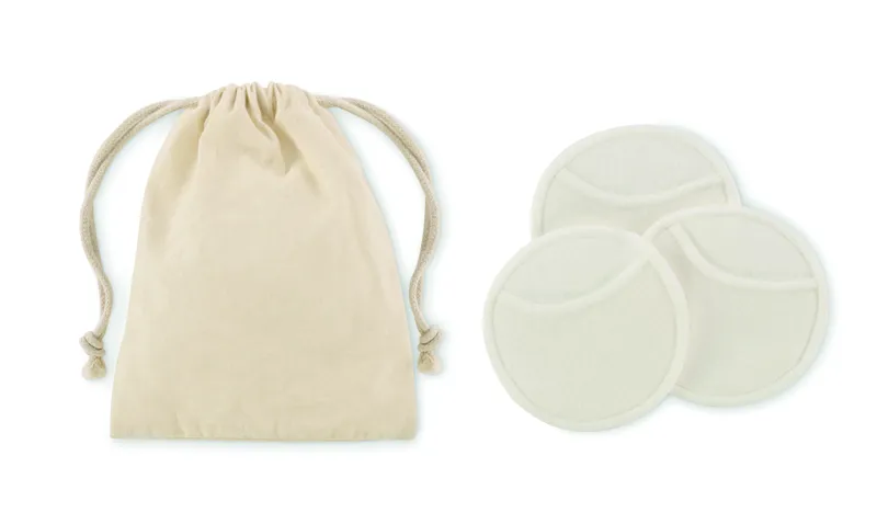 3 darab újrafelhasználható és mosható puha arctisztító párna (Ø 8cm) 70% bambuszrostból és 30% pamutból, húzózsinóros pamut tasakban.