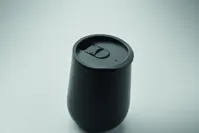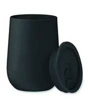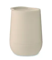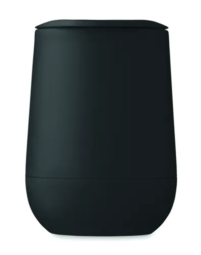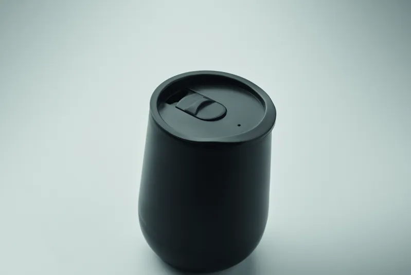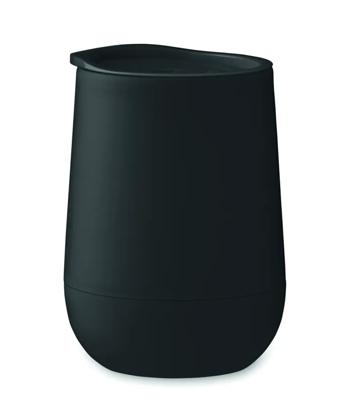 Duplafalú pohár PP-ből, csúsztatható ivónyílással ellátott, PS és ABS anyagból készült fedéllel. Űrtartalom: 300 ml.