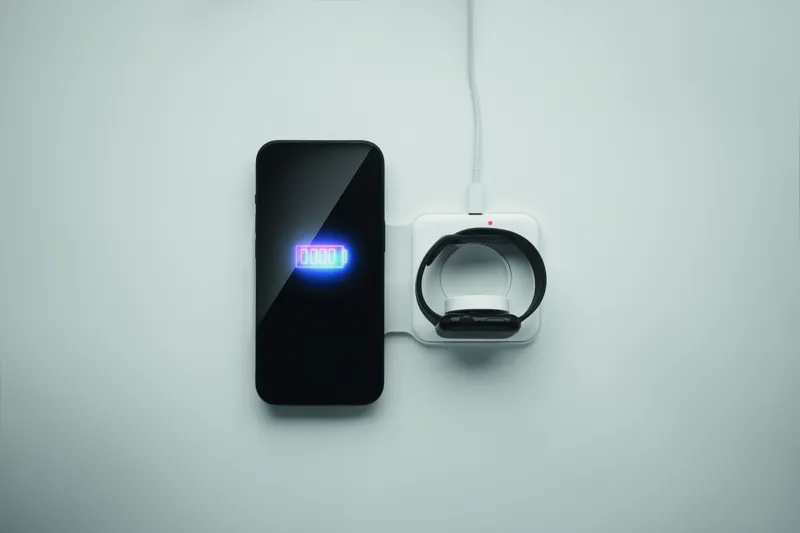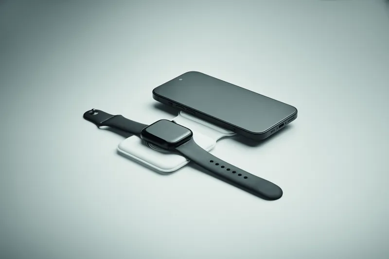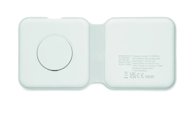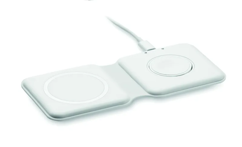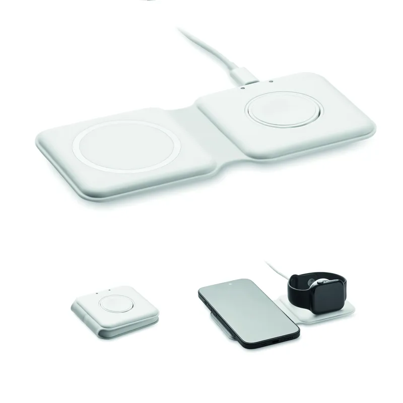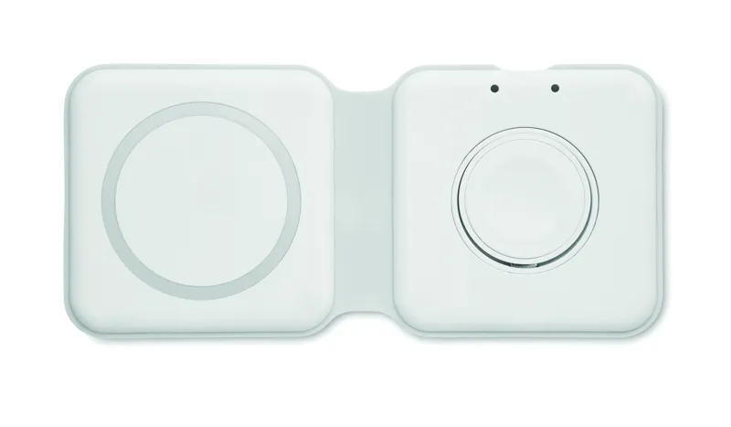 2 az 1-ben összecsukható töltőállomás ABS-ből. 15 W-os vezeték nélküli töltőt és okosóra-töltőt (csak Apple®) tartalmaz.