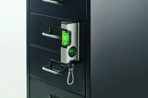 Mini mágneses, kettős vízmérték alumínium házban, karabinerrel. A karabiner hegymászásra, védőfelszerelés céljára nem alkalmas.