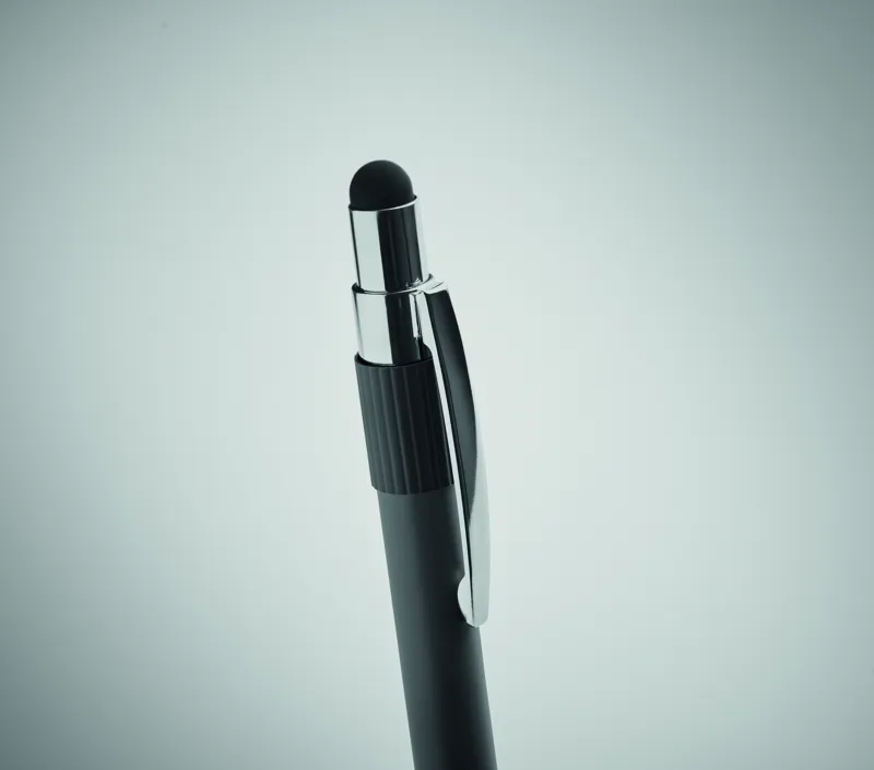 Nyomógombos, stresszoldó pörgettyűs golyóstoll újrahasznosított alumíniumból, érintőheggyel. Kéken író betéttel.