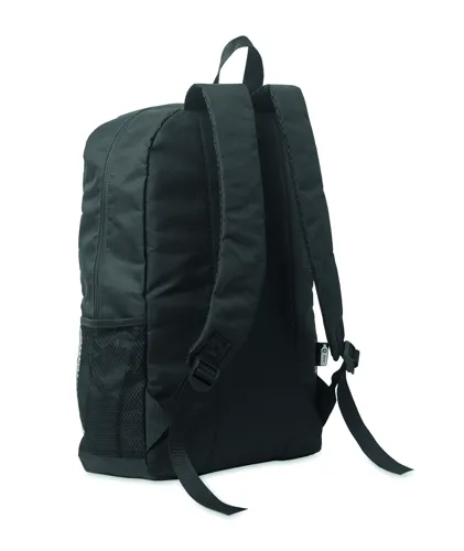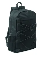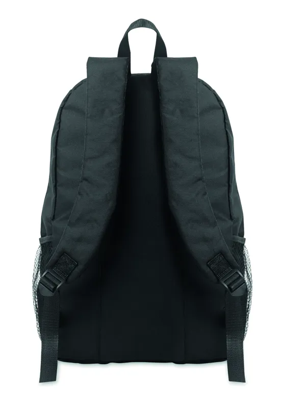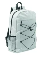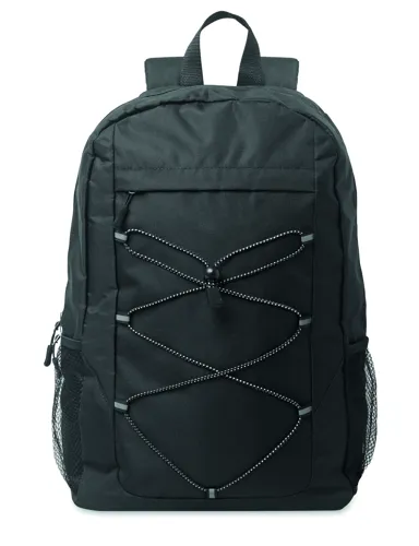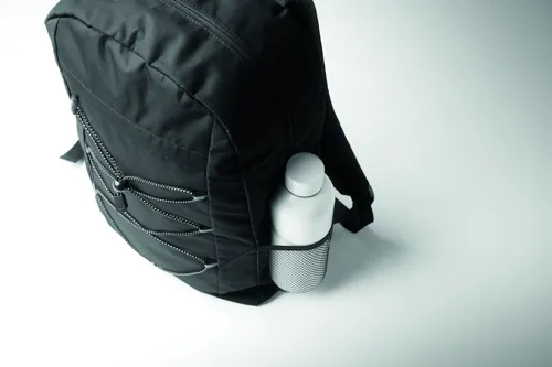 Hátizsák 600D RPET poliészterből, dekoratív zsinórral és cipzáras elülső zsebbel. Mindkét oldalán hálós zsebekkel.
