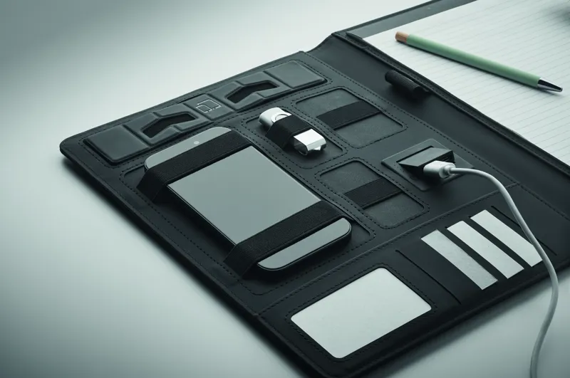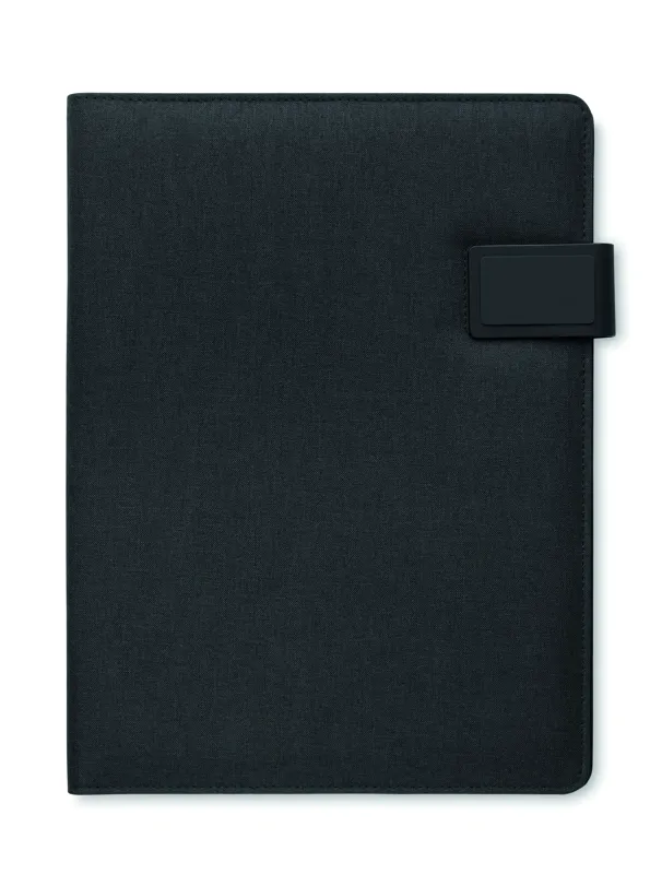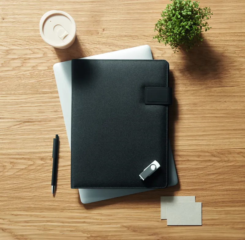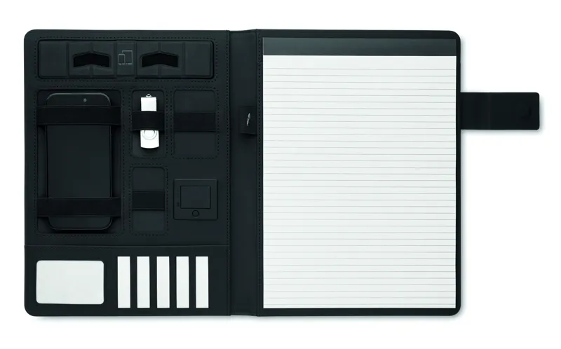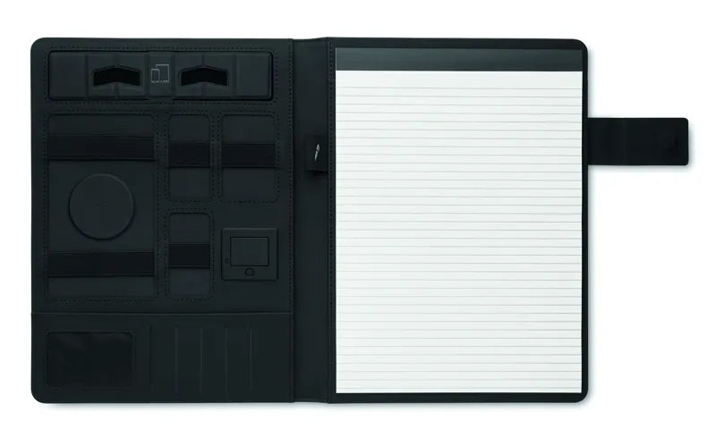 A4 iratmappa vászon-PU borítóval. 5000 mAh powerbank külső akkumulátor és 15 W mágneses vezeték nélküli töltő. 20 vonalas lapos jegyzettömb. Több belső rekesz. Mágneses záródás. Elasztikus tolltartó hurok.