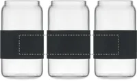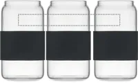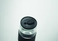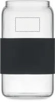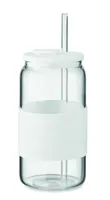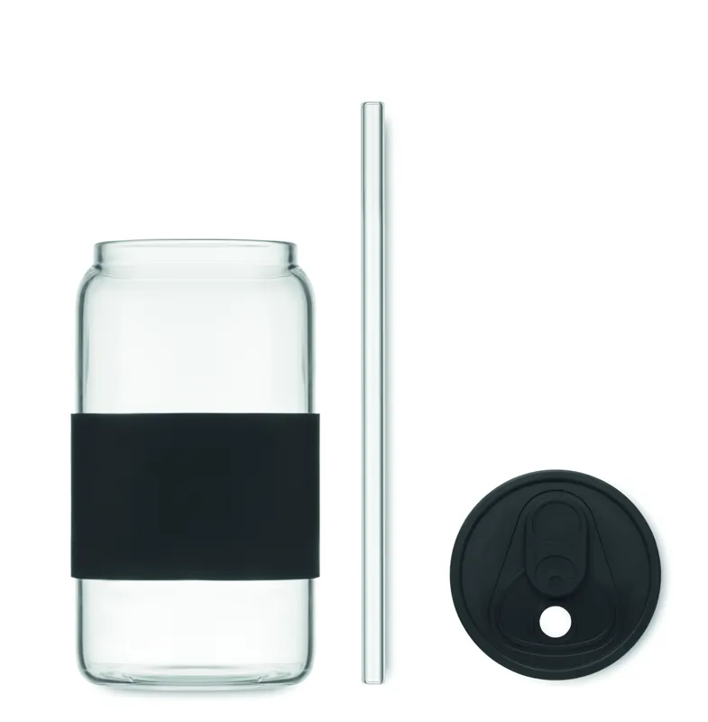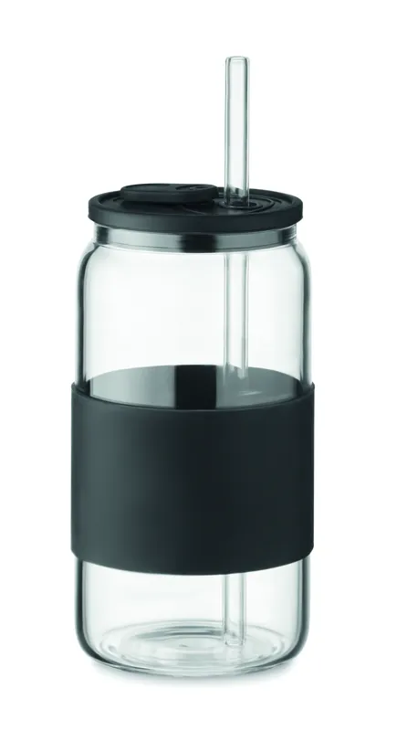 Boroszilikát üvegből készült pohár, szilikon fedéllel és markolattal, boroszilikát üveg szívószállal. Űrtartalom: 550 ml.
