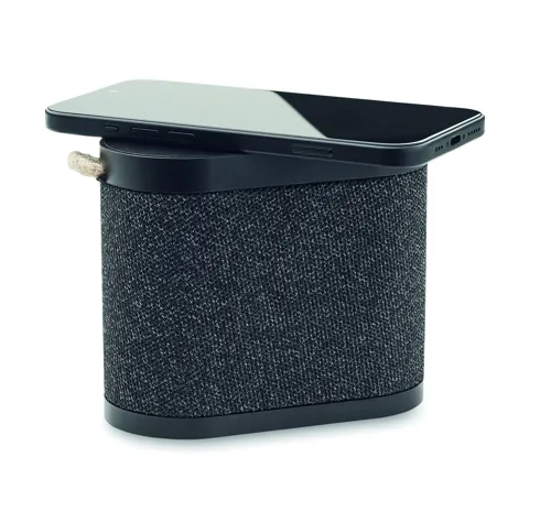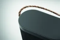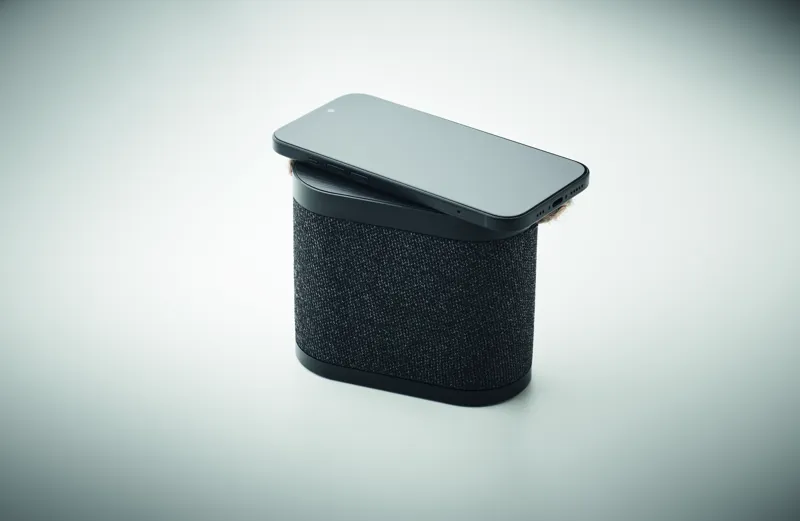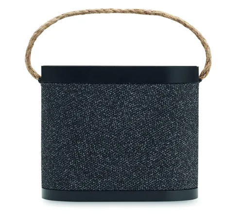 5.3 vezeték nélküli hangszóró ABS-ből, RPET poliészter hangfalselyemmel, fekete bevonatos bambusz 15W-os vezeték nélküli töltővel a tetején, juta fogantyúval. 1 újratölthető 1200 mAh lítium-ionos akkumulátor. Teljesítmény: 5W, 4 Ohm és 5V. Üzemidő kb. 4 óra.