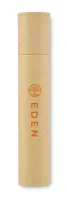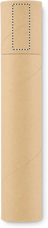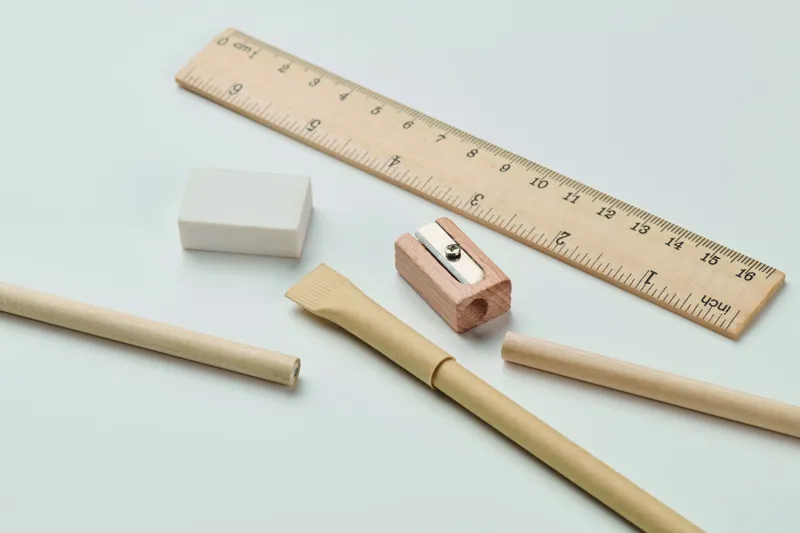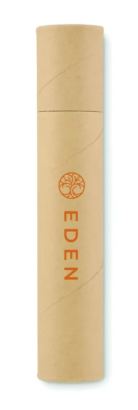 Újrahasznosított hengeres papírdoboz írószerkészlettel. 2 ceruzát, 1 karton tolltestű golyóstollat, 1 fa ceruzahegyezőt, 1 radírt és kis vonalzót tartalmaz.
