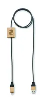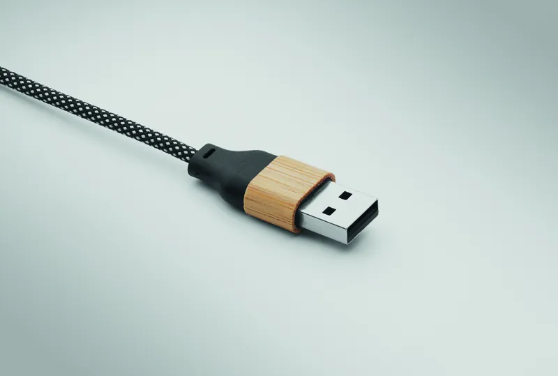 60W-os töltőkábel RPET-ből, bambusz részletekkel. Bemenet: 2 az 1-ben C-típusú és USB-A. Kimenet: C-típusú és 2 az 1-ben tűs.