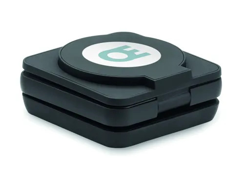 3 az 1-ben összecsukható töltőállomás gumírozott, újrahasznosított ABS-ből. 15 W-os mágneses vezeték nélküli töltőt, okosóra-töltőt (csak Apple®) és TWS töltőt tartalmaz.