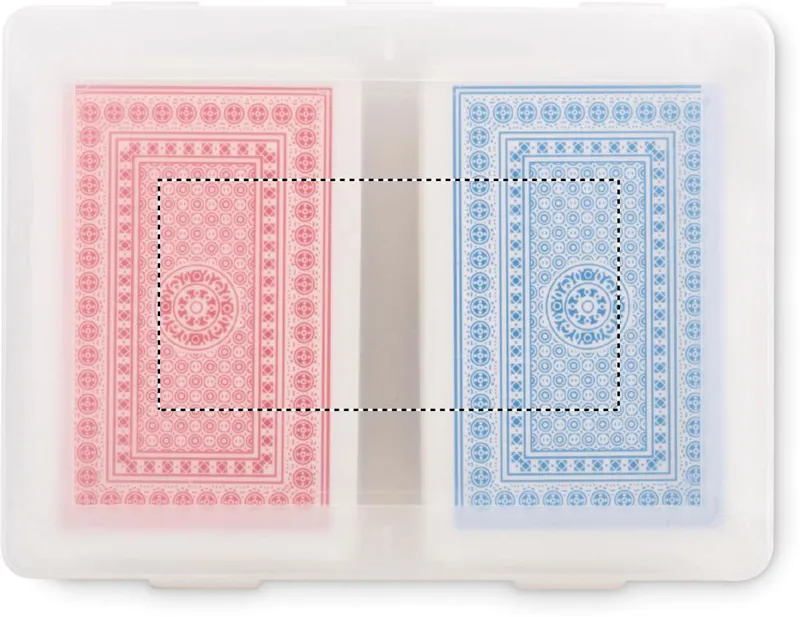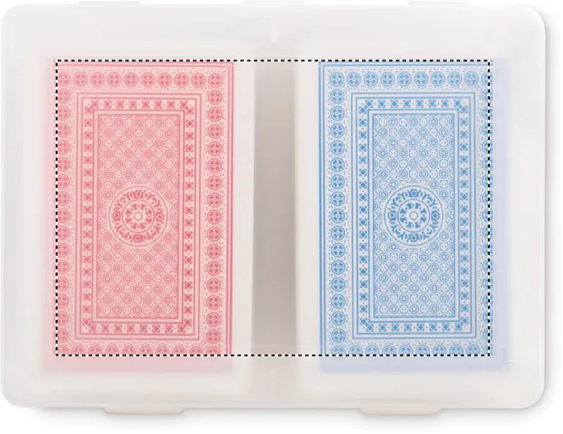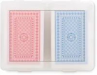 2 paklis franciakártya készlet újrahasznosított PP tokban. 2x54 kártyalap (piros és kék hátlappal).
