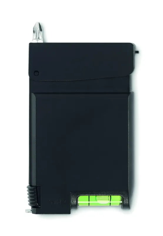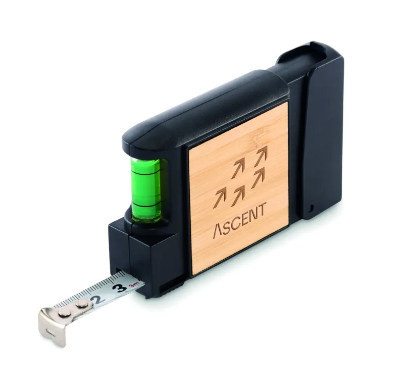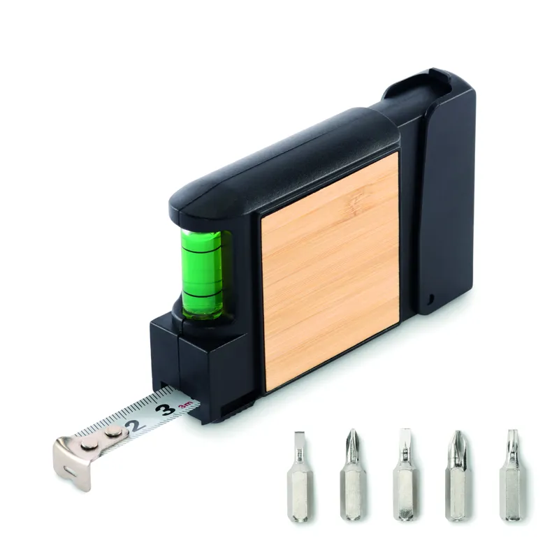 3 méteres multifunkciós mérőszalag ABS-ből, bambusz részletekkel, vízmértékkel és 5 csavarhúzó bit fejjel.