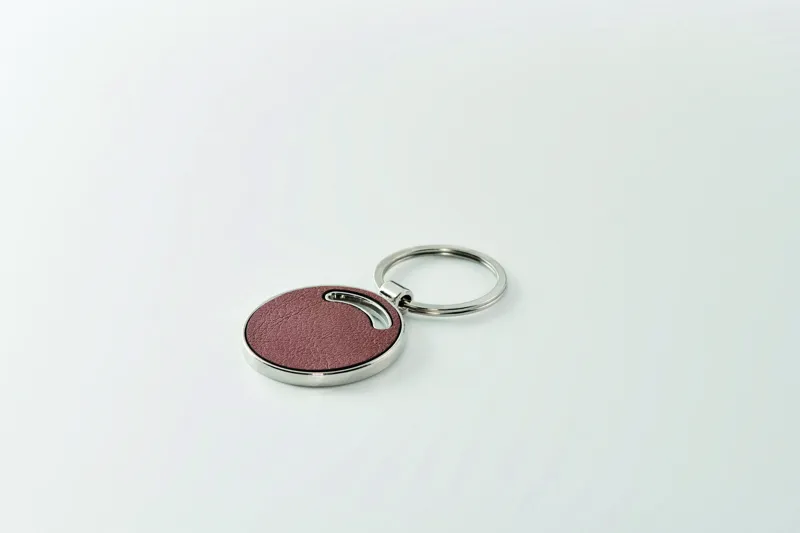 Kerek fém kulcstartó újrahasznosított PU-bőr betéttel.