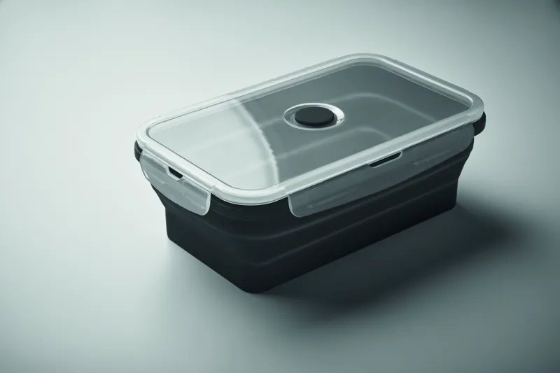 Összecsukható szilikon uzsonnás doboz PP fedéllel és szilikon szeleppel. Űrtartalom: 1200 ml.