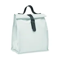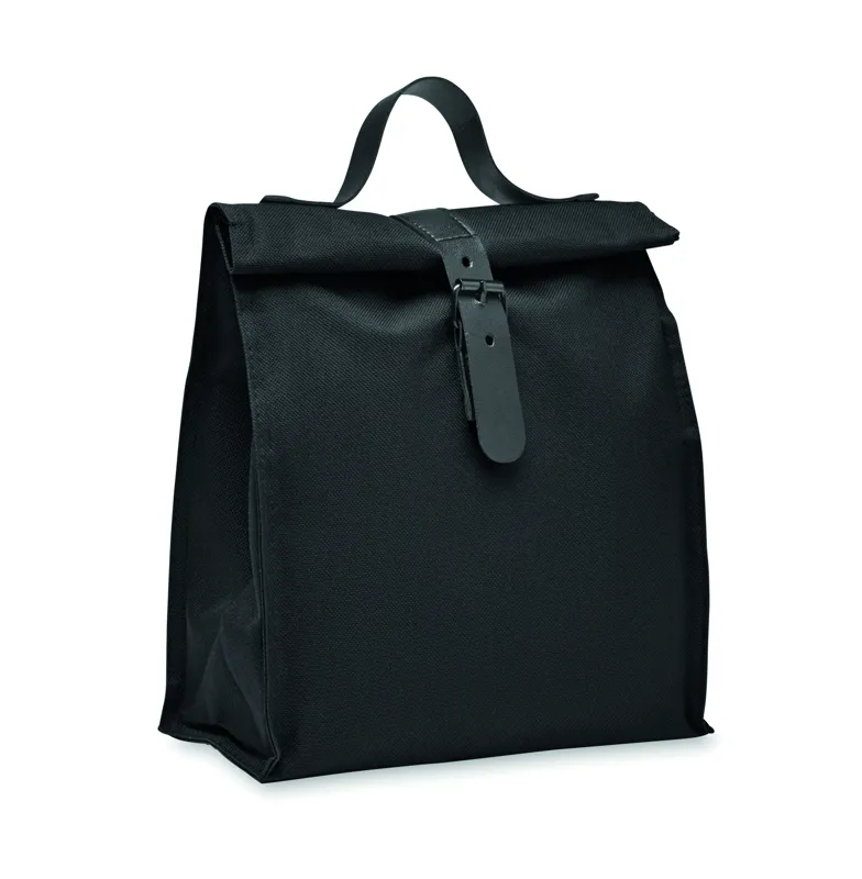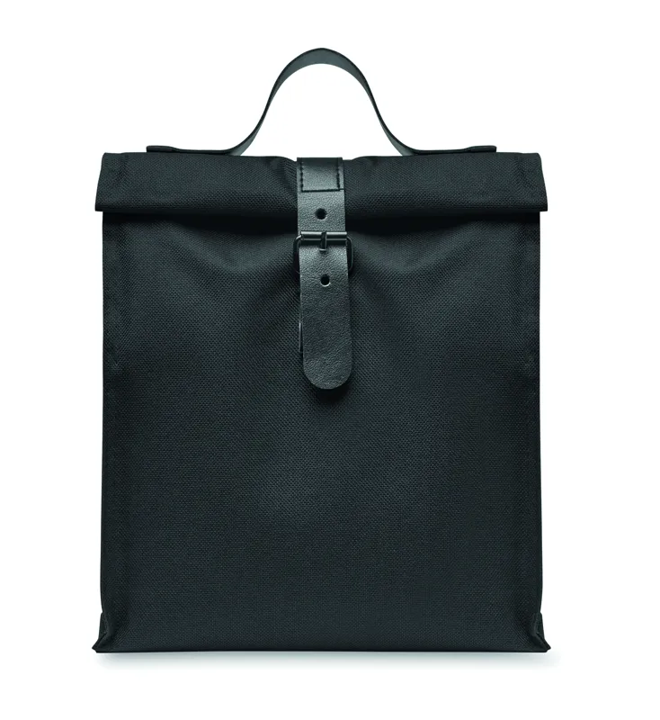 600D RPET poliészter, rolltop csavart záródású uzsonnás hűtőtáska PU fogantyúval és csatos pánttal. Szigetelés: 3 mm-es PE hab PEVA-val.