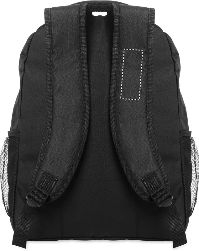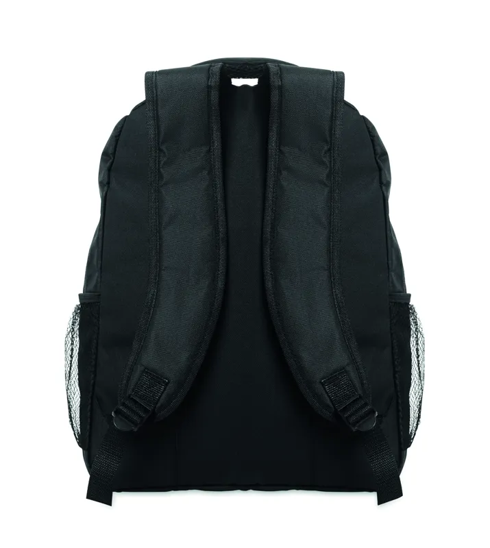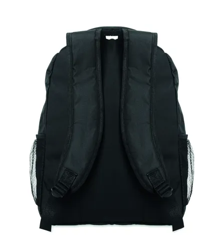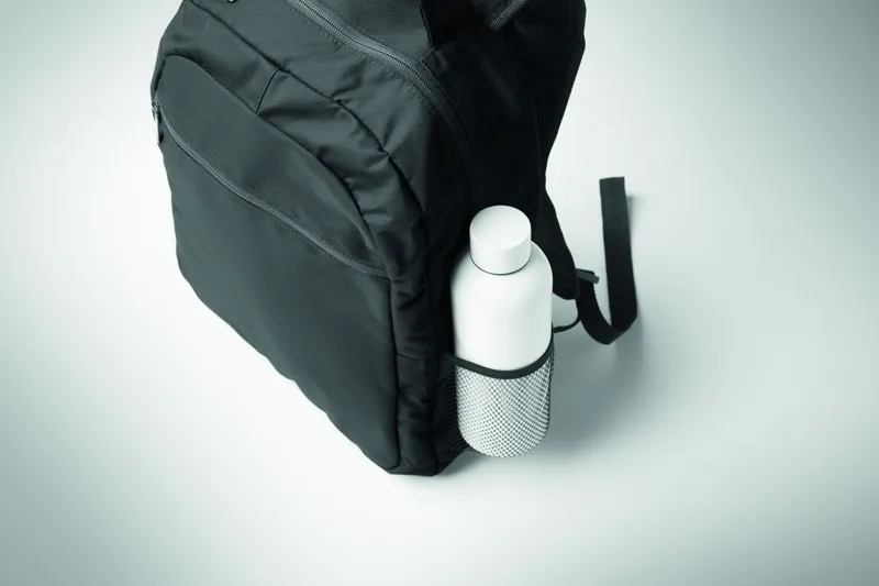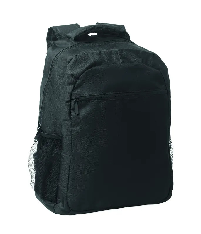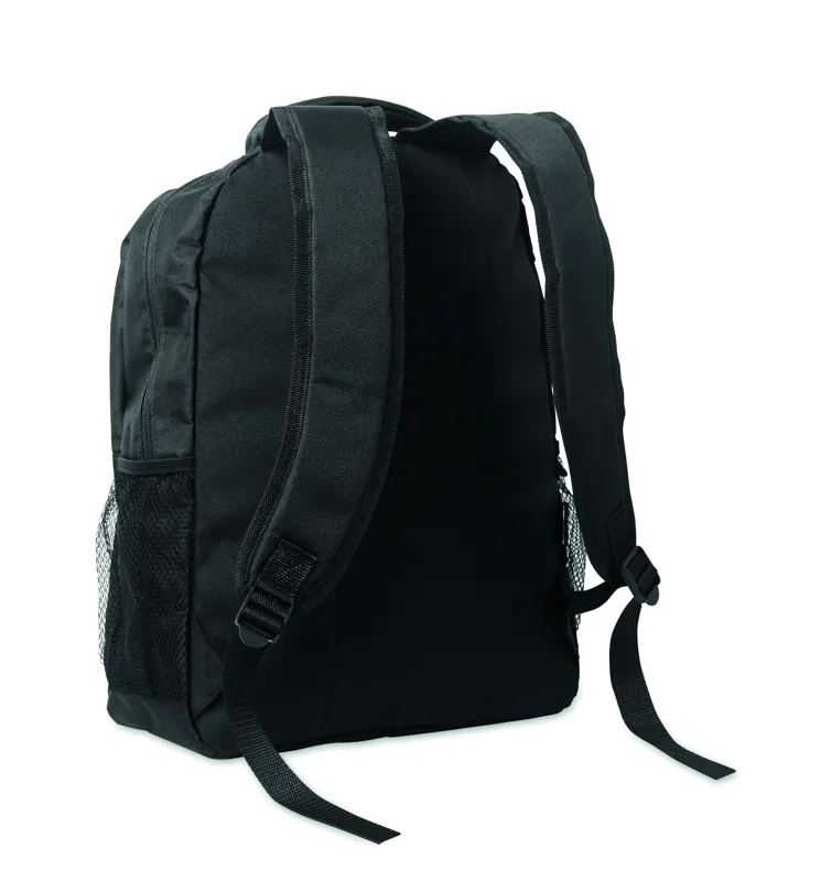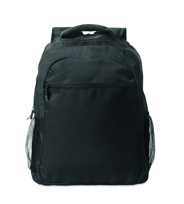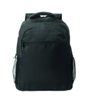 15 colos laptop hátizsák, 600D RPET poliészterből, párnázott laptop rekesszel, mindkét oldalán hálós zsebekkel és cipzáras elülső zsebbel.