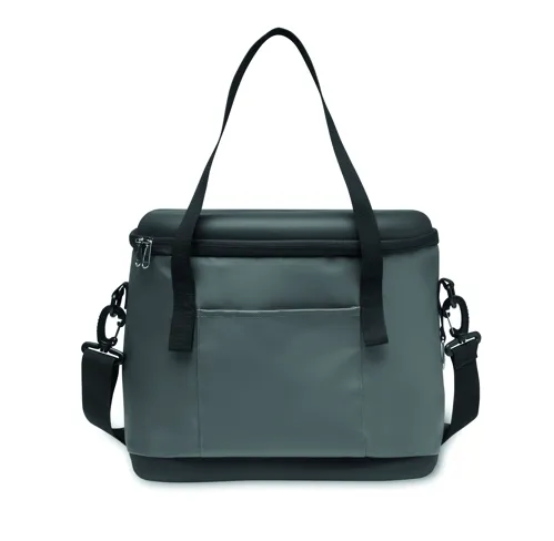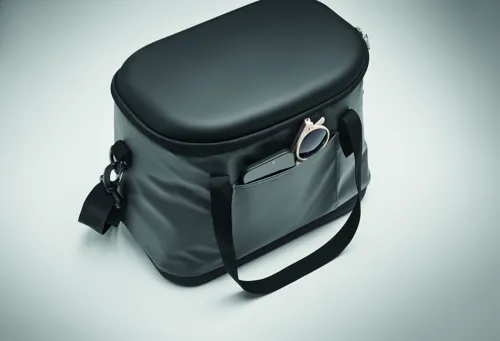 Hűtőtáska 50C tarpaulin, a tetején és alján merev PEVA anyagból, az oldalán üvegnyitóval. 1 elülső zsebbel és 1 belső hálós zsebbel. Szigetelés: PE habréteg. 2 hordfüllel, állítható és levehető vállpánttal. Kapacitás: 16 l.