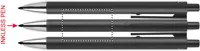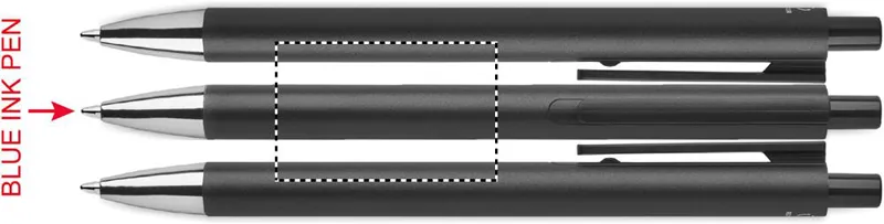 Újrahasznosított alumínium tollkészlet, golyóstollal és grafit, tintamentes tollal. Kéken író betéttel. Újrahasznosított papírdobozban.