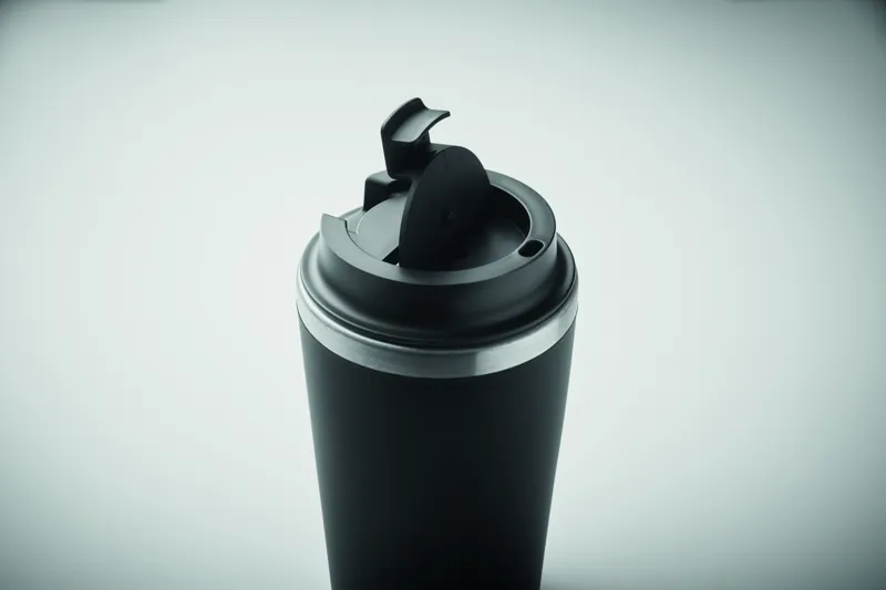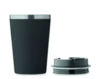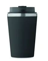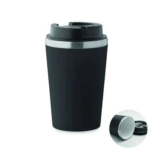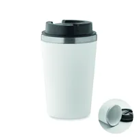 Duplafalú pohár, kívül PP, belül újrahasznosított rozsdamentes acél (90% újrahasznosított rozsdamentes acél és 10% rozsdamentes acél), kerámia belső bevonattal. Szivárgásmentes. Űrtartalom: 350 ml.