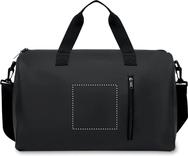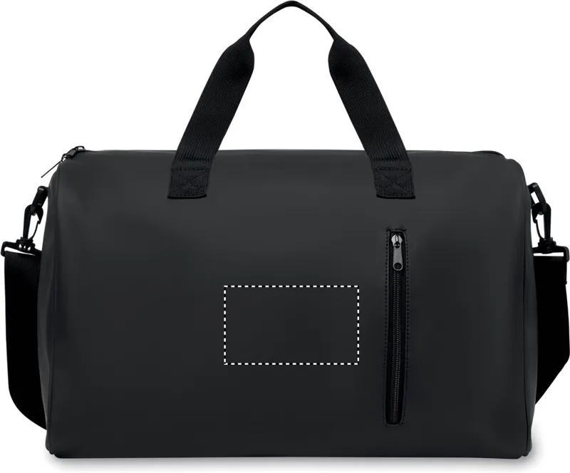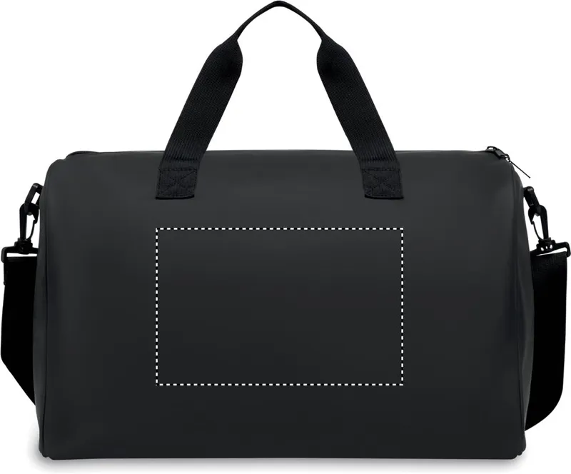 Sport- vagy utazótáska puha PU anyagból, alsó habszivacs megerősítéssel. Egy fő rekesz, cipzáras elülső zseb. 210D RPET poliészter bélés. 2 hordfül, állítható és levehető vállpánt.