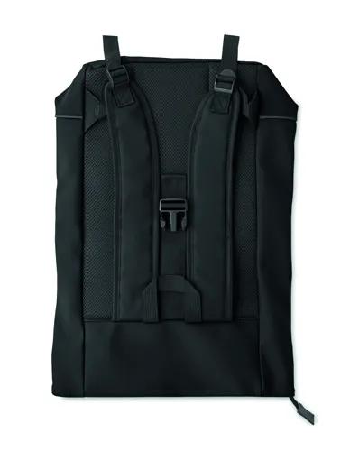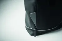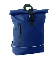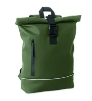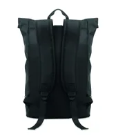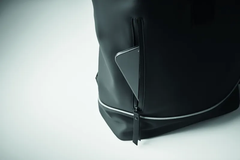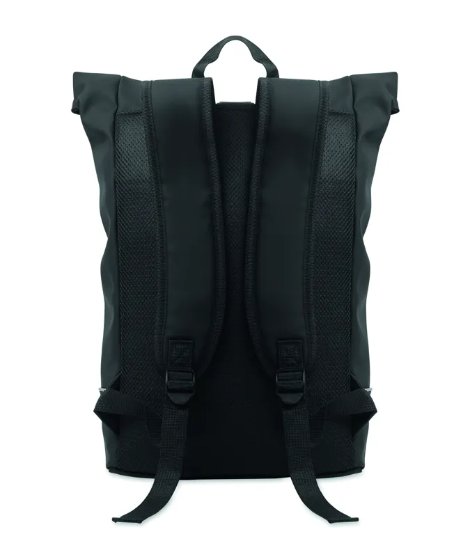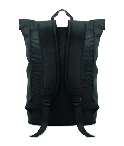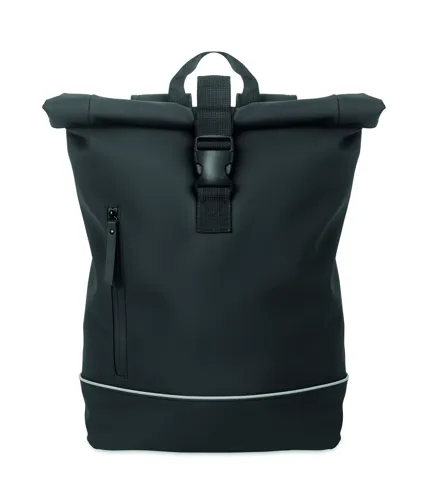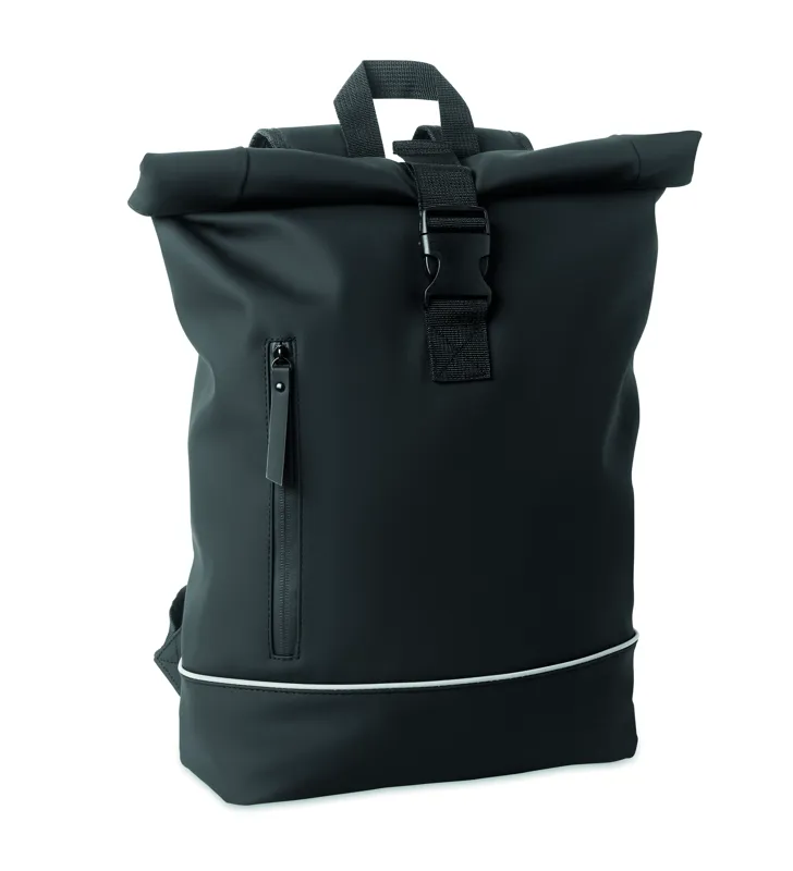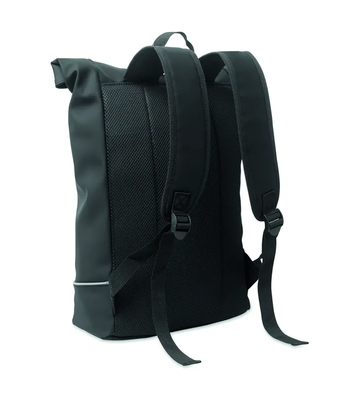15 colos, rolltop csavart záródású laptop hátizsák puha PU anyagból, párnázott hátoldallal és megerősített, fényvisszaverő csíkkal ellátott aljjal. Vízálló cipzáras elülső zseb. 210D RPET poliészter bélés.