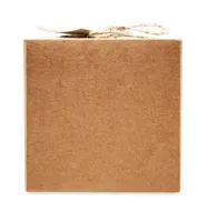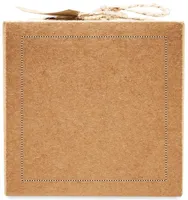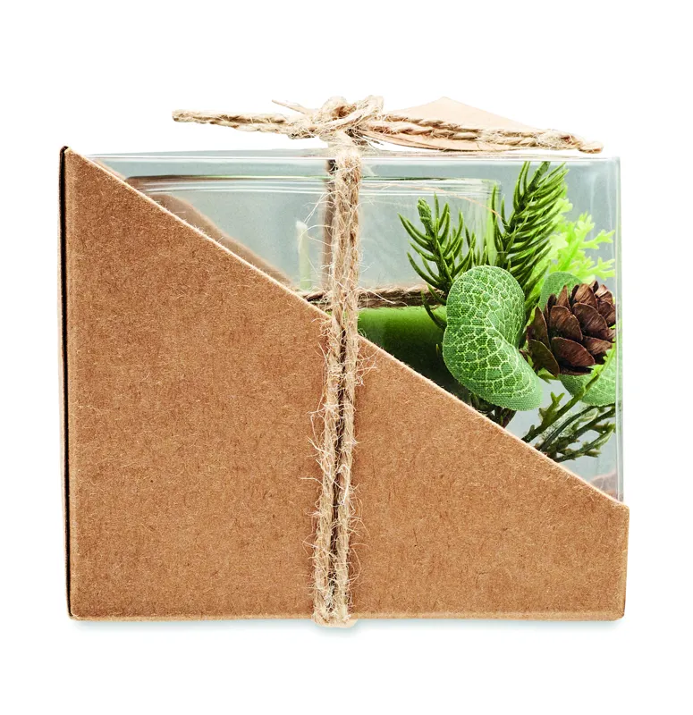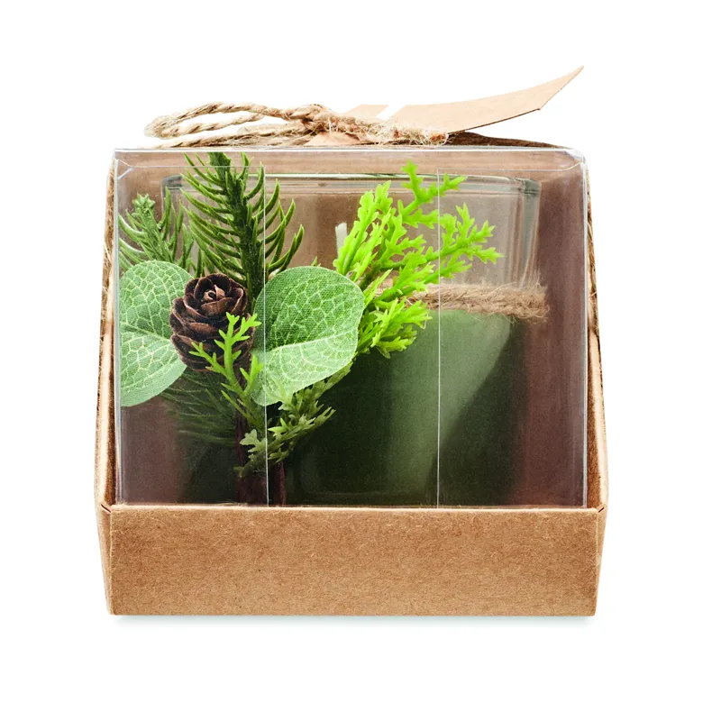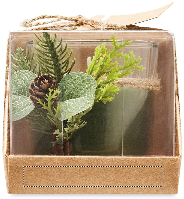 Gyertya (120 g) üveg tartóban, karácsonyi dekorációval. Juta zsinórral átkötött PVC fedeles karton dobozban, kraftpapír ajándékkísérő címkével.