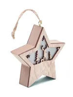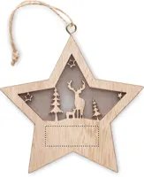 MDF karácsonyfadísz világítással, karácsonyi motívummal, akasztózsinórral. A működéshez szükséges 3 db LR44 elemmel szállítjuk.