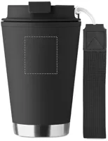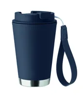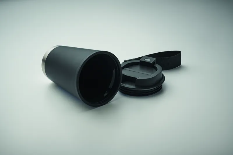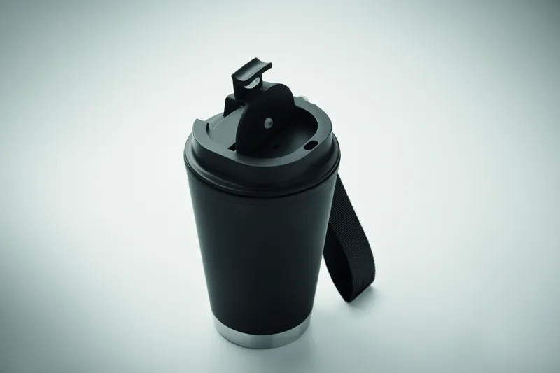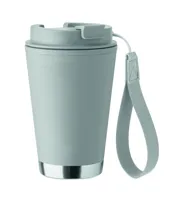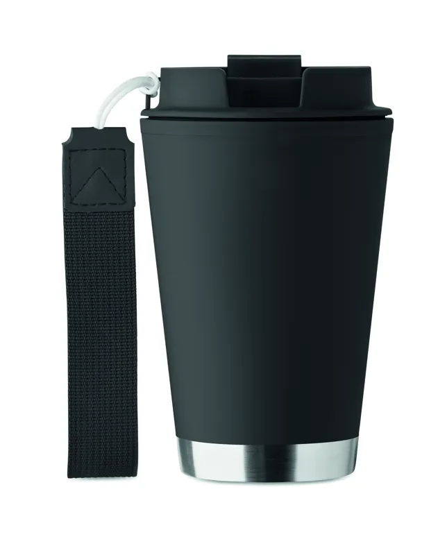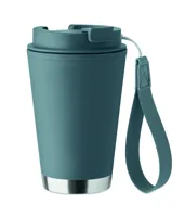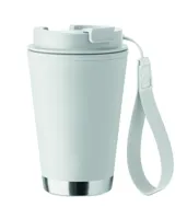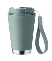 Duplafalú pohár PP belső- és újrahasznosított PP külső fallal, újrahasznosított rozsdamentes acél részlettel az alján, RPET csuklópánttal. Űrtartalom: 300 ml.