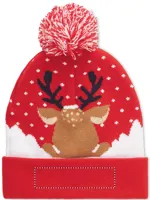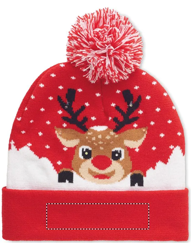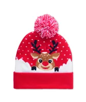 Karácsonyi kötött sapka 6 LED-es lámpával, mandzsettás aljjal, bojttal, puha, rugalmas akril anyagból. 3 világítási móddal. A működéshez szükséges 1 db CR2032 elemmel szállítjuk.