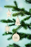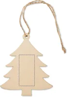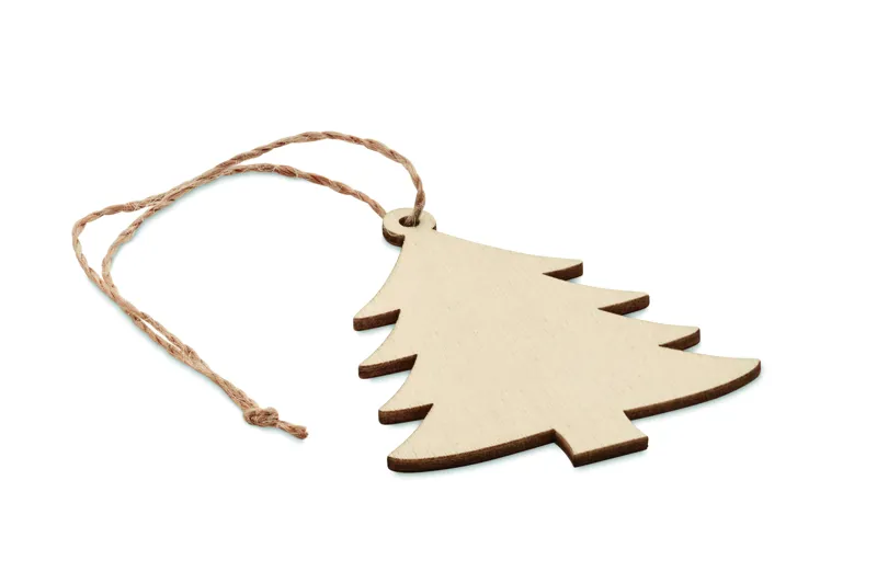 Fából készült fenyő alakú karácsonyfadísz, juta zsinórral.