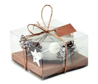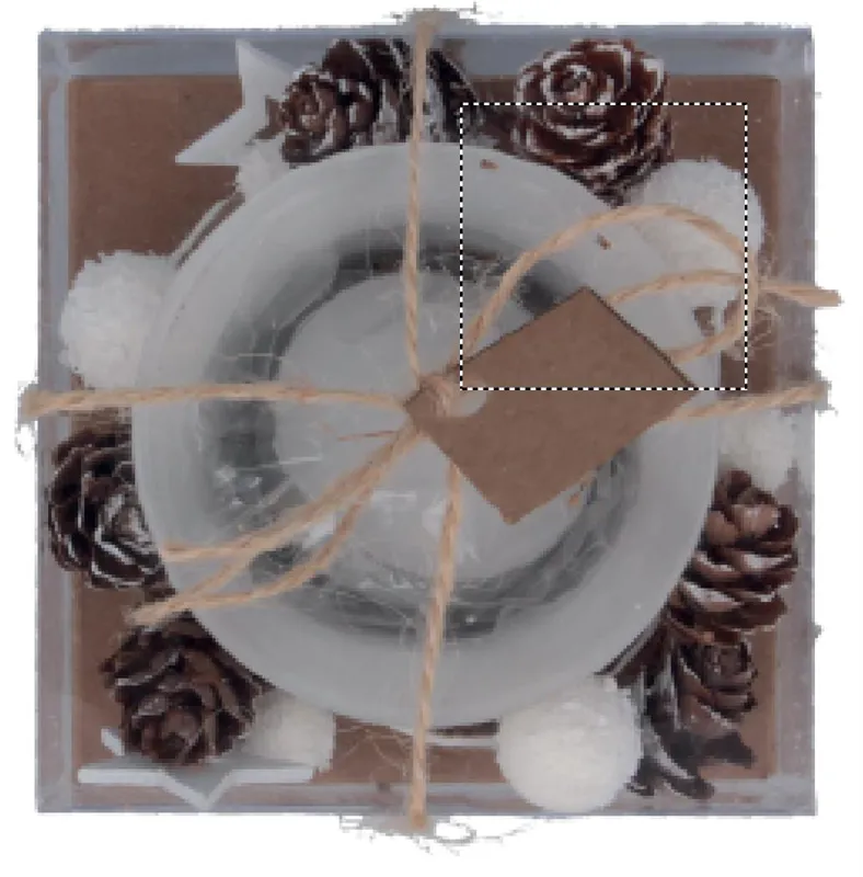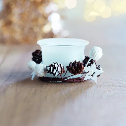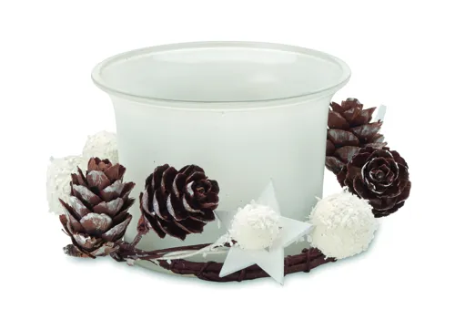 Díszekkel körbevett üveg mécsestartó. Karton és PVC ajándékdobozban, zsinórral átkötve, kis ajándékkísérő kártyával szállítjuk.