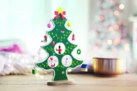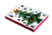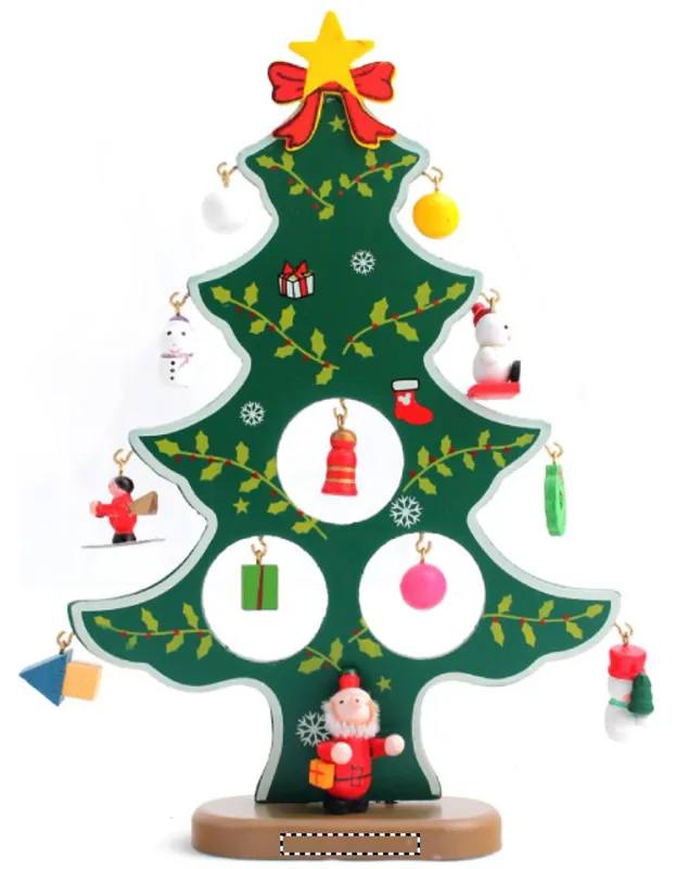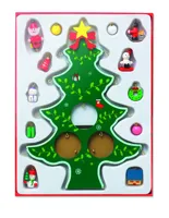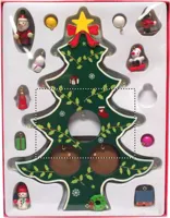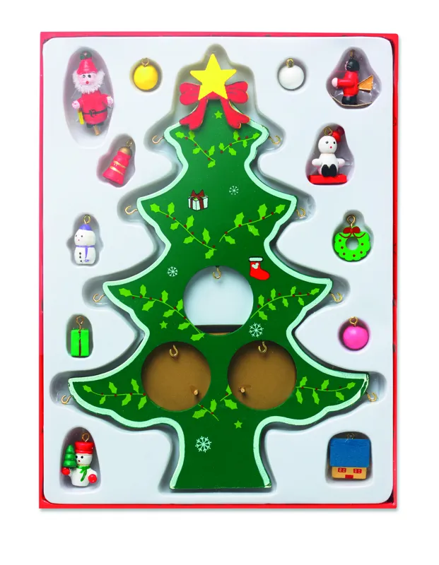 Karácsonyfa alakú fadekoráció 12 db különböző ráakasztható mini karácsonyfadísszel. Átlátszó tetejű PVC dobozban.