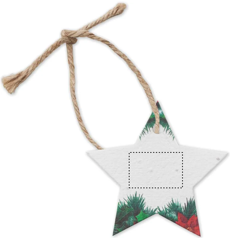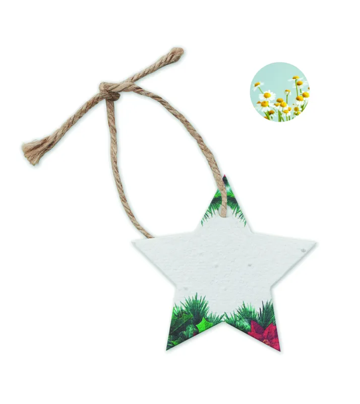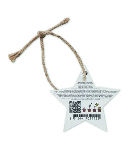 Csillag alakú, magpapír karácsonyi függődísz, vadvirág magkeverékkel, juta zsinórral. Használat után elültetve a magvakból vadvirágok hajtanak ki. EU-ban gyártva.