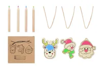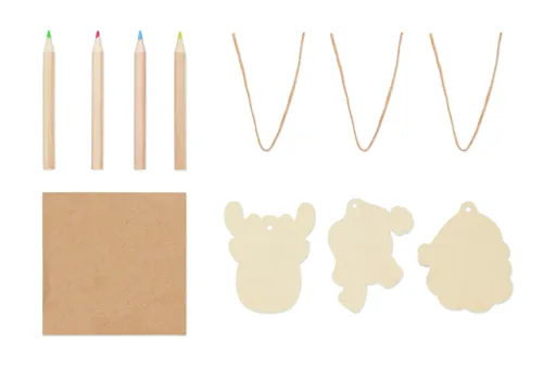 3 darab fából készült, kiszínezhető karácsonyfadíszből álló készlet, 4 színes ceruzával. Kraftpapír dobozban. A fa természetes anyag, termékenként szín- és méretbeli eltérések jelentkezhetnek, ami befolyásolhatja a dekoráció végső eredményét.