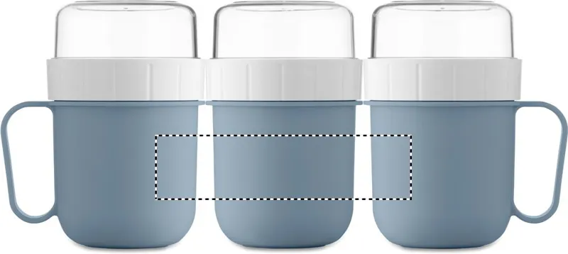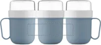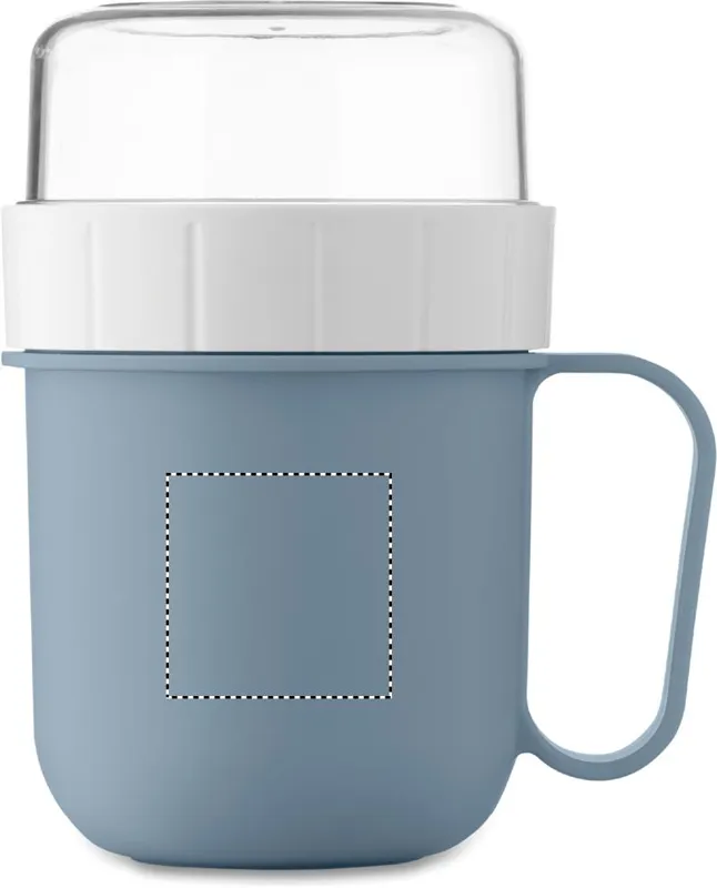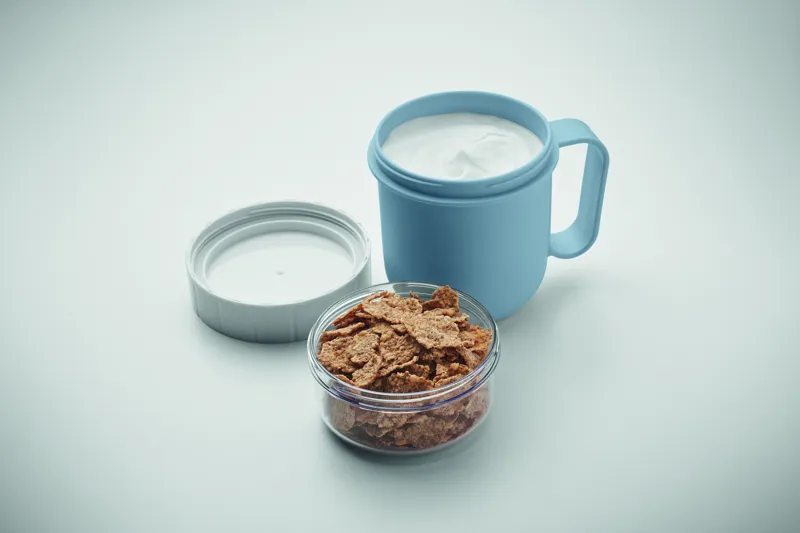 Reggeliző- vagy úti bögre PP-ből, PS tartállyal. A két külön rekeszben elkülöníthetők a hozzávalók. Szivárgásmentes. Űrtartalom: 450 ml és 160 ml.