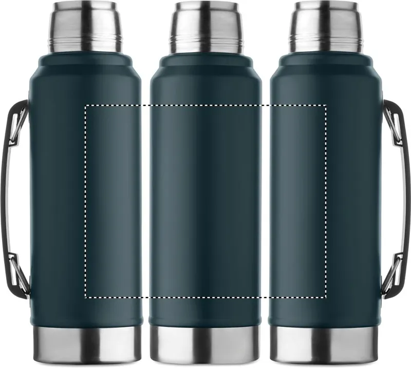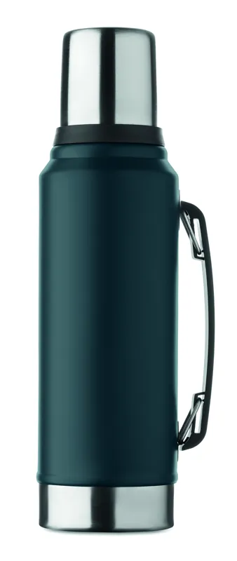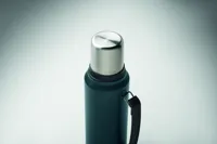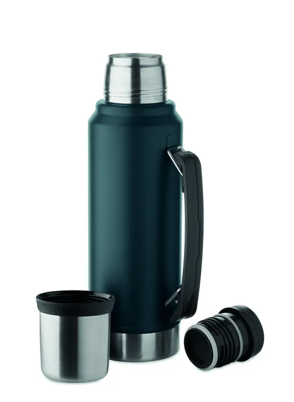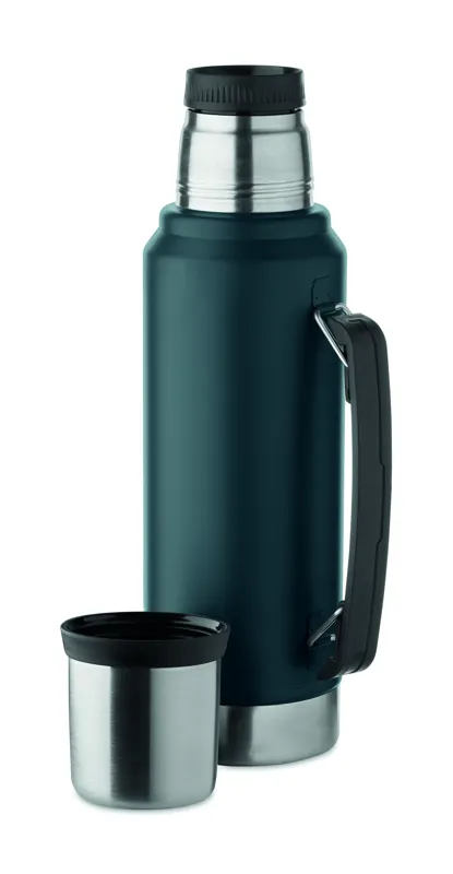 Duplafalú termoszpalack újrahasznosított rozsdamentes acélból (90% újrahasznosított rozsdamentes acél és 10% rozsdamentes acél), az oldalán fogantyúval. Belső PP fedéllel és újrahasznosított rozsdamentes acél pohárral. Szivárgásmentes. Űrtartalom: 1 liter.