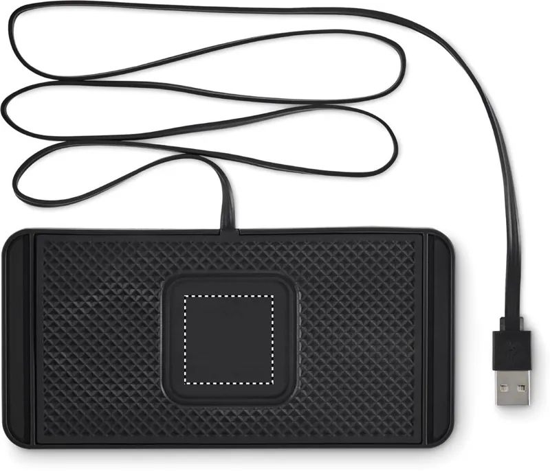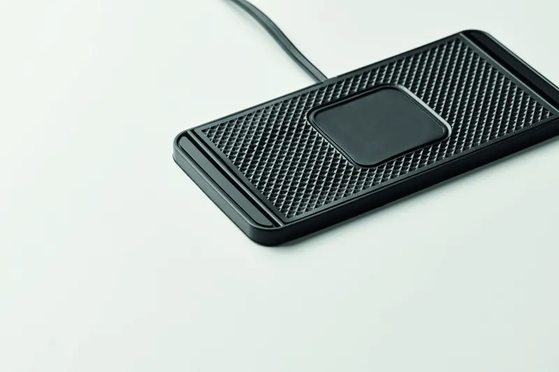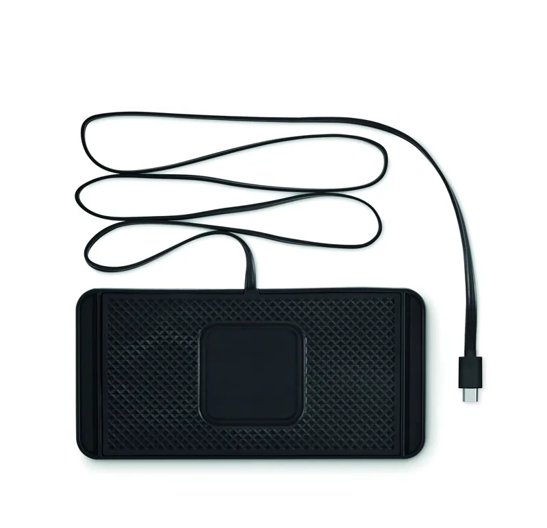 Autós, 15W-os vezeték nélküli töltő, PVC csúszásgátló lappal. Állítható, szélei méretre vághatók. Integrált USB-A kábel, hossza 120 cm.