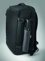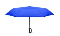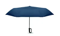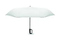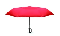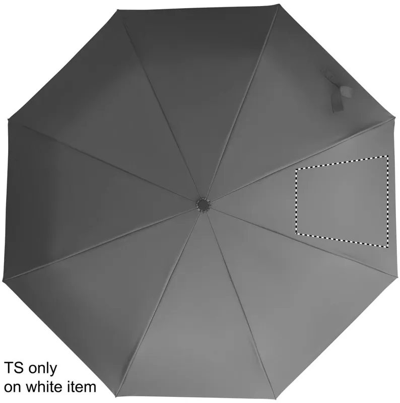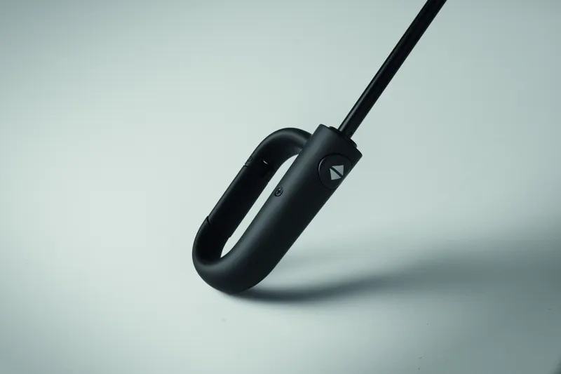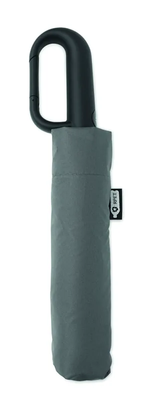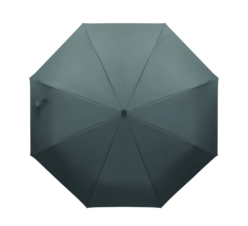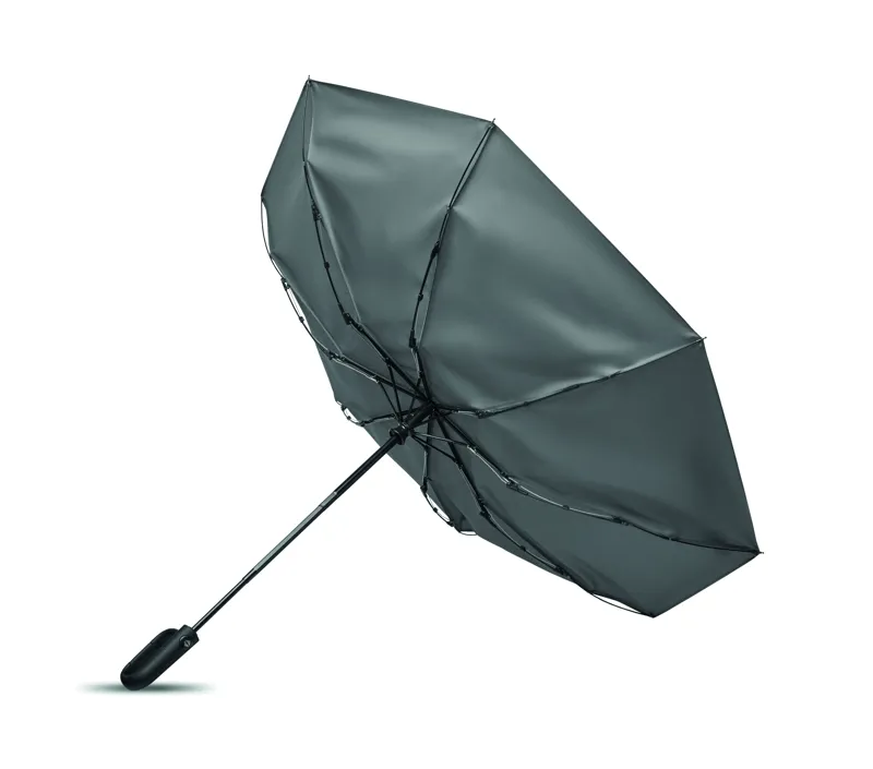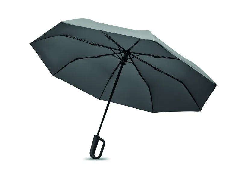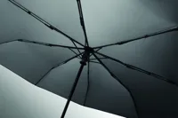 Összecsukható 21'' szélálló esernyő teljes fekete bevonatú üvegszálas vázzal, 2 szekcióval. Üvegszálas bordák. 190T RPET pongyola panelek. D alakú karabineres fogantyú w / gumi kivitelben,. Automatikus nyitás és zárás. Tartalmazza a tasakot