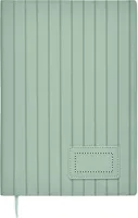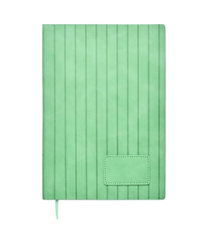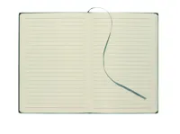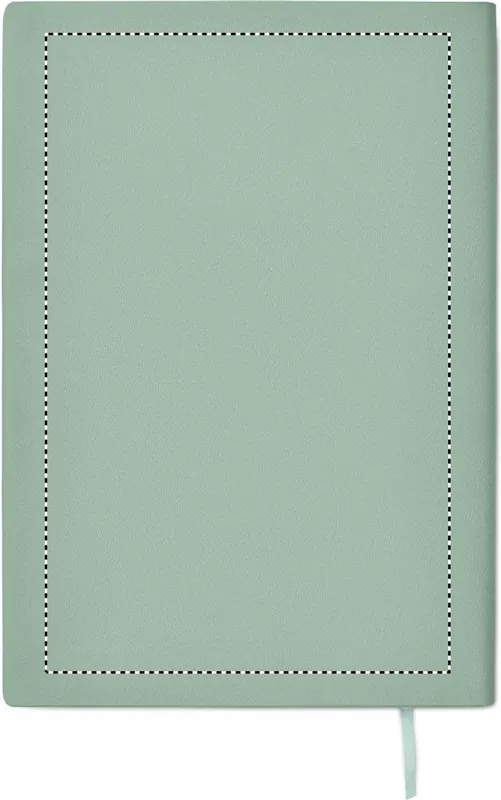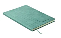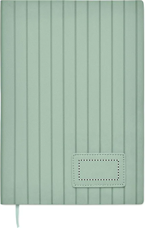 A5 jegyzetfüzet, füstös mintázatú, bordázott, 40% fogyasztás utáni újrahasznosított PU és 60% PU, puhafedeles borítóval, sima PU emblémázható címkével. 160 vonalas oldal (80 lap), 70 g/m² újrahasznosított papírból. Illeszkedő színű, poliészter könyvjelző szalag.
