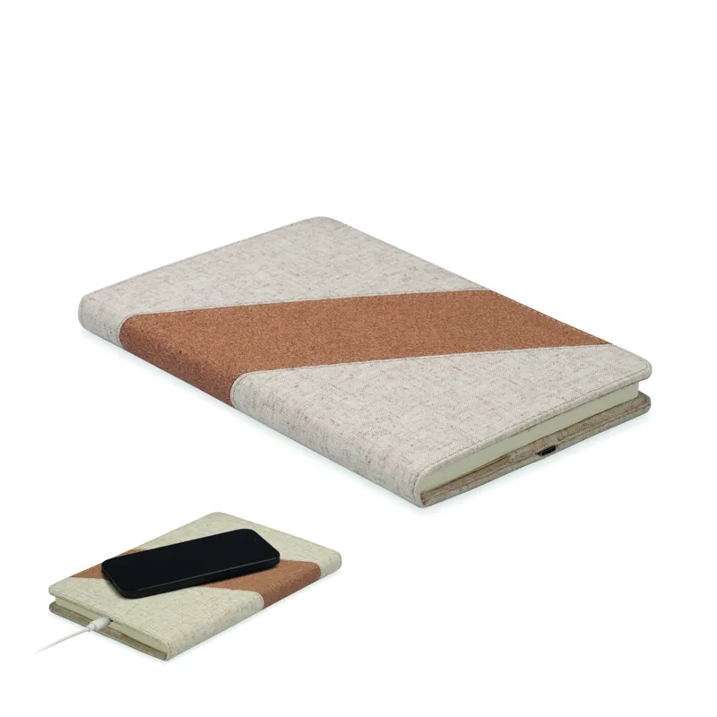 2 az 1-ben notesz. A5 jegyzetfüzet beépített, 15W-os vezeték nélküli töltővel. Pamut és parafa részletek a borítón, 128 vonalas oldal (64 lap). Könyvjelző szalag.