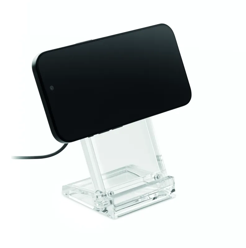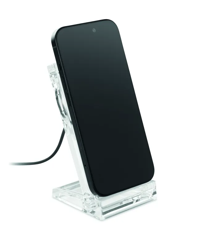 Mágneses, 15W vezeték nélküli töltő akrilból, telefonállvánnyal. Áramforráshoz csatlakoztatva vezeték nélkül tölti fel mobilkészülékét. Kimenet: 9V/1,67A (15W) a gyors töltéshez.