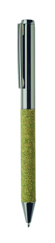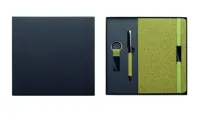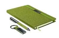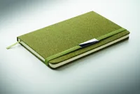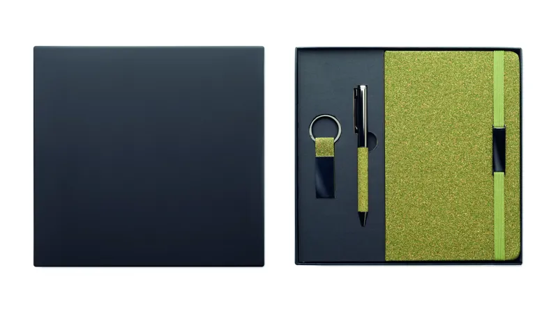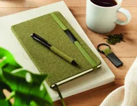 Ajándékkészlet, tartalma: A5 keménytáblás jegyzetfüzet 160 vonalas oldallal (80 lappal) 70 g/m² újrahasznosított papírból, csavarzáras fém golyóstoll és kulcstartó. 20% teazacc, 30% parafa és 50% poliészter-pamut részletek. Fém dekoráció az elasztikus zárópánton. FSC®-certified | FSC MIX CREDIT, N7.1, FSC-C213206