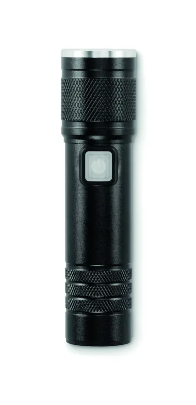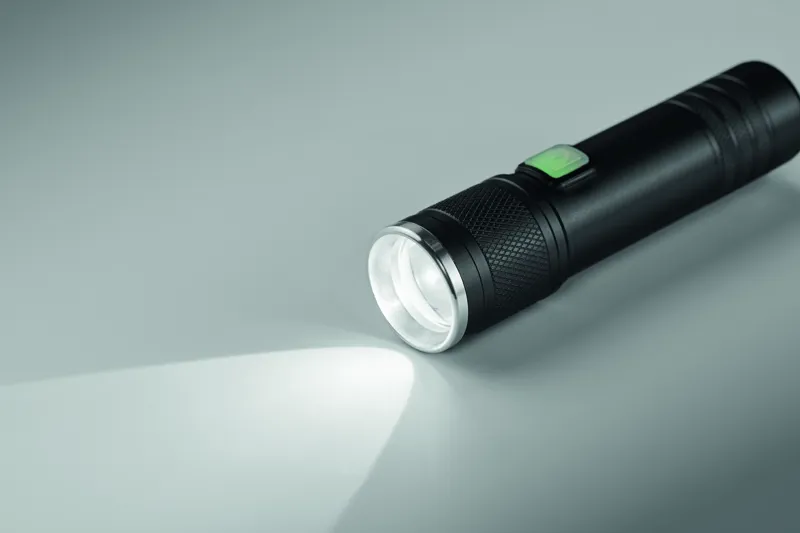 Újratölthető COB zseblámpa újrahasznosított alumíniumból. 100 lumen fényerővel, 3 fénybeállítással és fókuszálási funkcióval. Beépített 800 mAh újratölthető akkumulátor. Töltőkábellel.