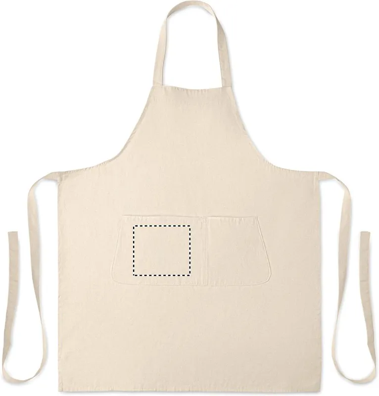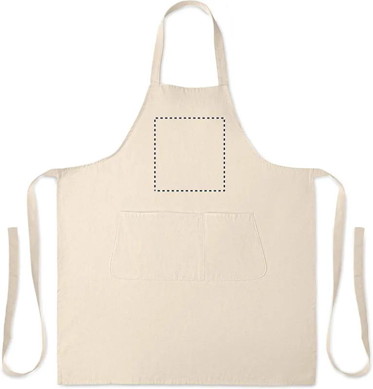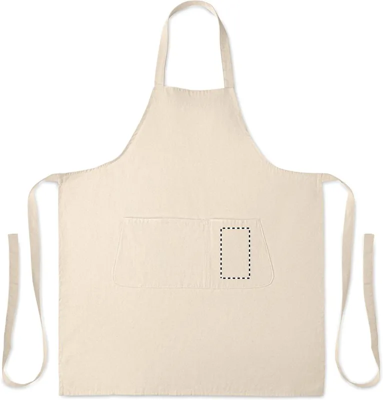 Állítható teljes kötény 1 nagy elülső, 2 rekeszre osztott zsebbel, 240 g/m² biopamutból. Gombbal állítható hosszúságú nyakpánttal.