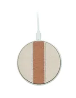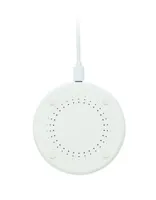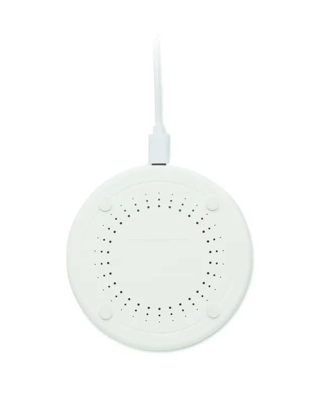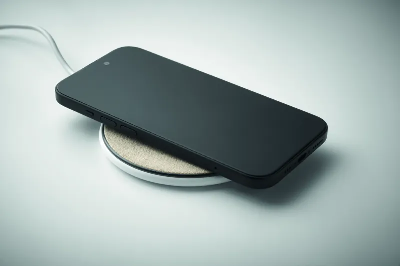 Vezeték nélküli töltő újrahasznosított ABS-ből, pamut és parafa részletekkel. Csatlakoztassa a számítógéphez és helyezze rá az okostelefont. Kimenet: DC 9V/1.67A (15W).